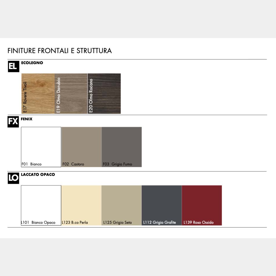 • Interni: in finitura grigio metal. Cassetti con sponde in metallo e fondo in legno grigio metal.