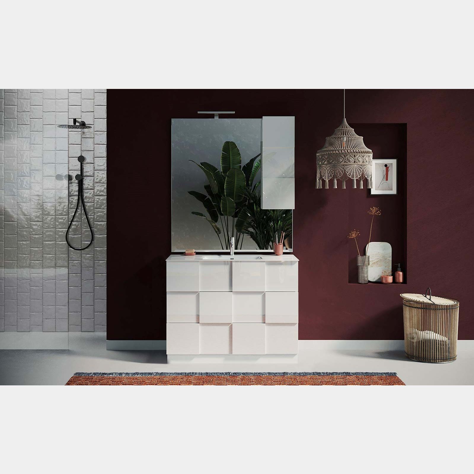 Carattetistica che subito emerge del mobile da bagno è l'estetica dei frontali: i quadrati in rilievo catturano l'attenzione assicurando al mobile da bagno un forte impatto rispetto l'arredo circostante.
