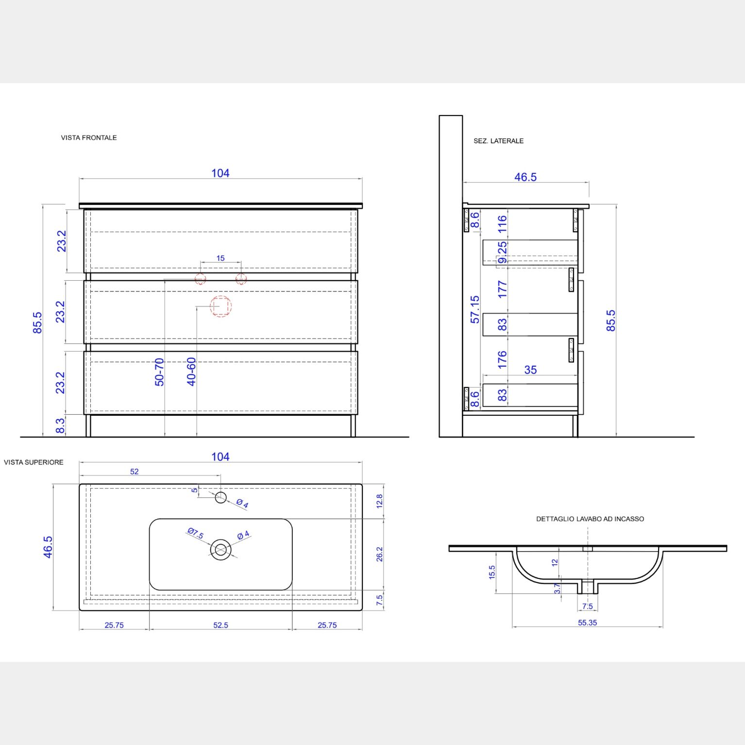 Il mobile offre un'ampia capienza per tutti gli oggetti che vengono utilizzati quotidianamente in bagno; i tre ampi cassetti forniscono infatti un notevole spazio cui riporre prodotti per l'igiene, cosmetici, asciugamani e prodotti per la pulizia.