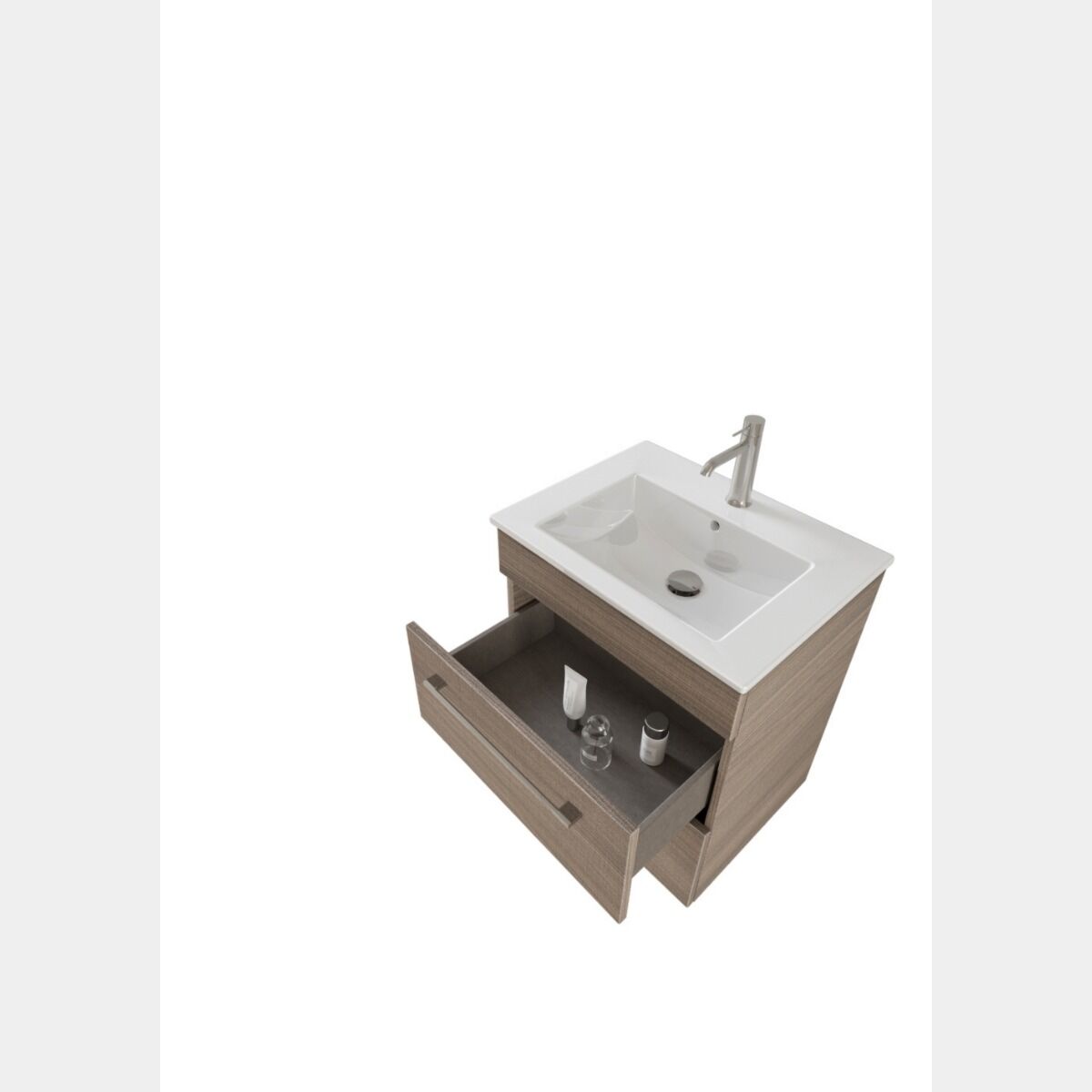 Il mobiletto bagno è realizzato con pannelli in agglomerato di legno con superfice in lamina melaminica in finitura legno con venatura in rilievo, è dotato di 2 cassetti con guide di scorrimento metalliche e apertura e chiusura ammortizzata ad estrazione totale, regolabili in alto/basso.
