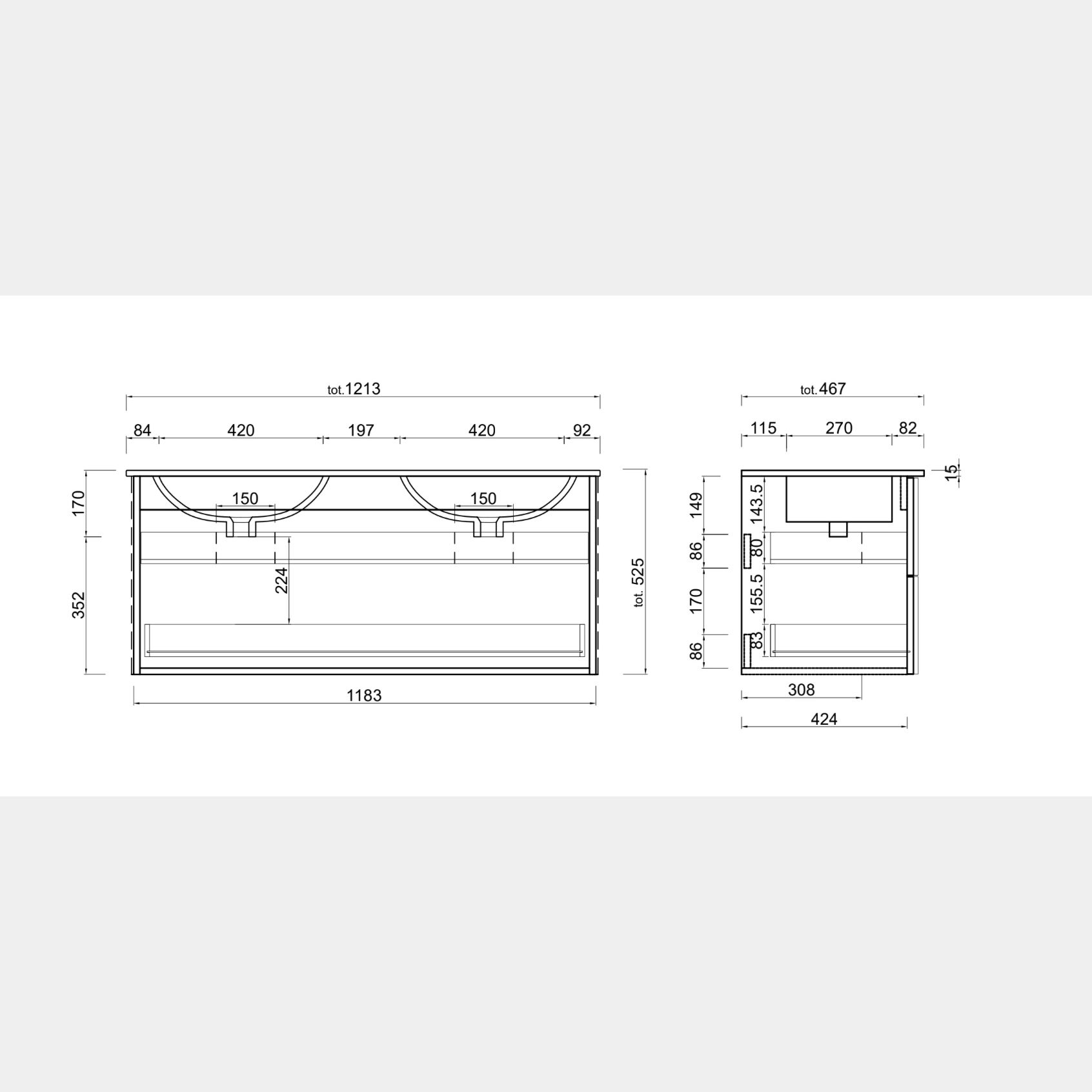 Questo modello sospeso è caratterizzato da due pratici cassetti e da due ampi lavabi in ceramica inclusi nel prezzo!