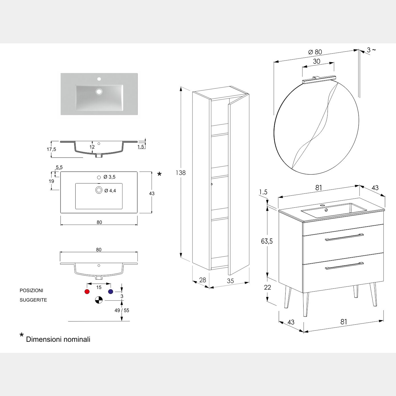 Il mobile bagno viene fornito con il lavabo integrato in ceramica in finitura bianco lucido con troppopieno e foro miscelatore e con il set di 4 piedini in finitura Nero opaco, H.22. Può essere richiesto inoltre lo specchio tondo D.80 sp.2.8 (optional), la lampada con illuminazione LED a basso consumo di energia, IP 44, potenza 220V (optional), la colonna sospesa dotata di 3 ripiani interni e sistema di apertura/chisura ammortizzato.