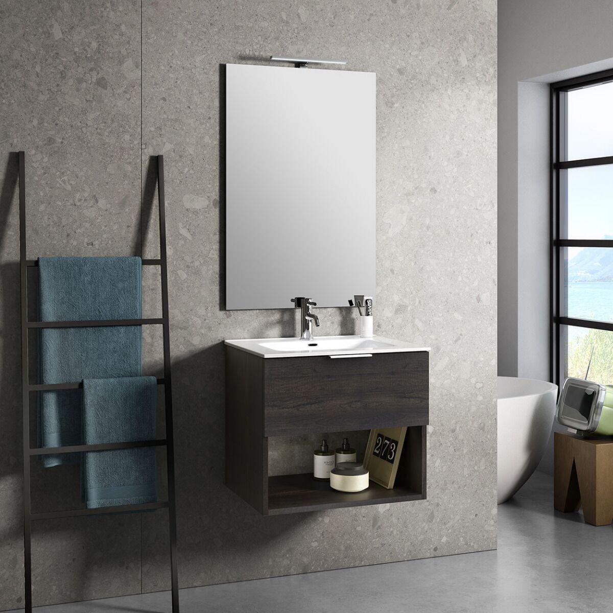 Una moderna soluzione per arredare il tuo bagno composta da una base sospesa in melaminico antigraffio colore Testa di moro con cassettone a scorrimento e dotato di chiusura soft close; al di sotto c'è un vano a giorno in cui riporre asciugamani, sapone ecc. Il mobile è anche completo di lavabo in ceramica con foro troppopieno. Sopra alla base c'è uno specchio reversibile, con telaio in ritiro in abs colore argento e una lampada led a luce fredda 6000k (non sostituibile), 8W, AC220/240V, 50-60Hz, 640 Lumen, IP44, RoHS, CE, classe energetica A++