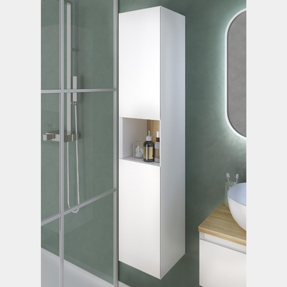 Caratterizzato dalla presenza di due finiture il mobile da bagno sospeso offre una soluzione d'arredo moderna ed elegante, capace di donare luce e calore all'ambiente. La finitura in Bianco laccato opaco viene valorizzata dal Rovere naturale presente nel vano a giorno e top. Il mix and match che si crea assicura una totale personalizzazione del bagno. Le finiture proposte possono essere sostituite per creare un accostamento in perfetta armonia con il proprio ambiente, a disposizione vi sono oltre cinquanta finiture laccate e dieci materiche per top e vano.