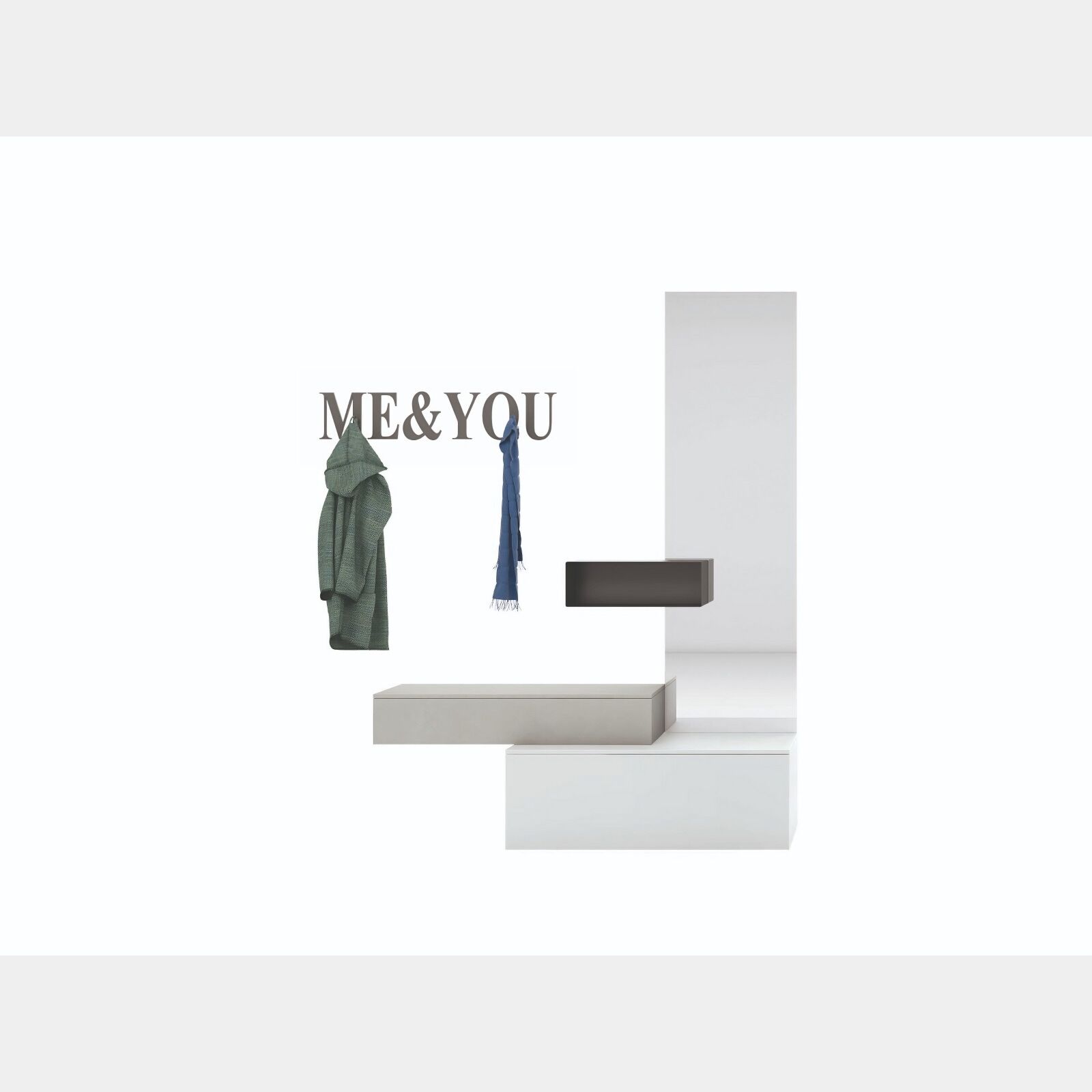 Questo mobile da ingresso materico cemento chiaro, laccato opaco bianco gesso e metallo antracite con specchio è la soluzione perfetta per te! Caratterizzato dal design innovativo, è dotato di appendiabiti con scritta Me & You.