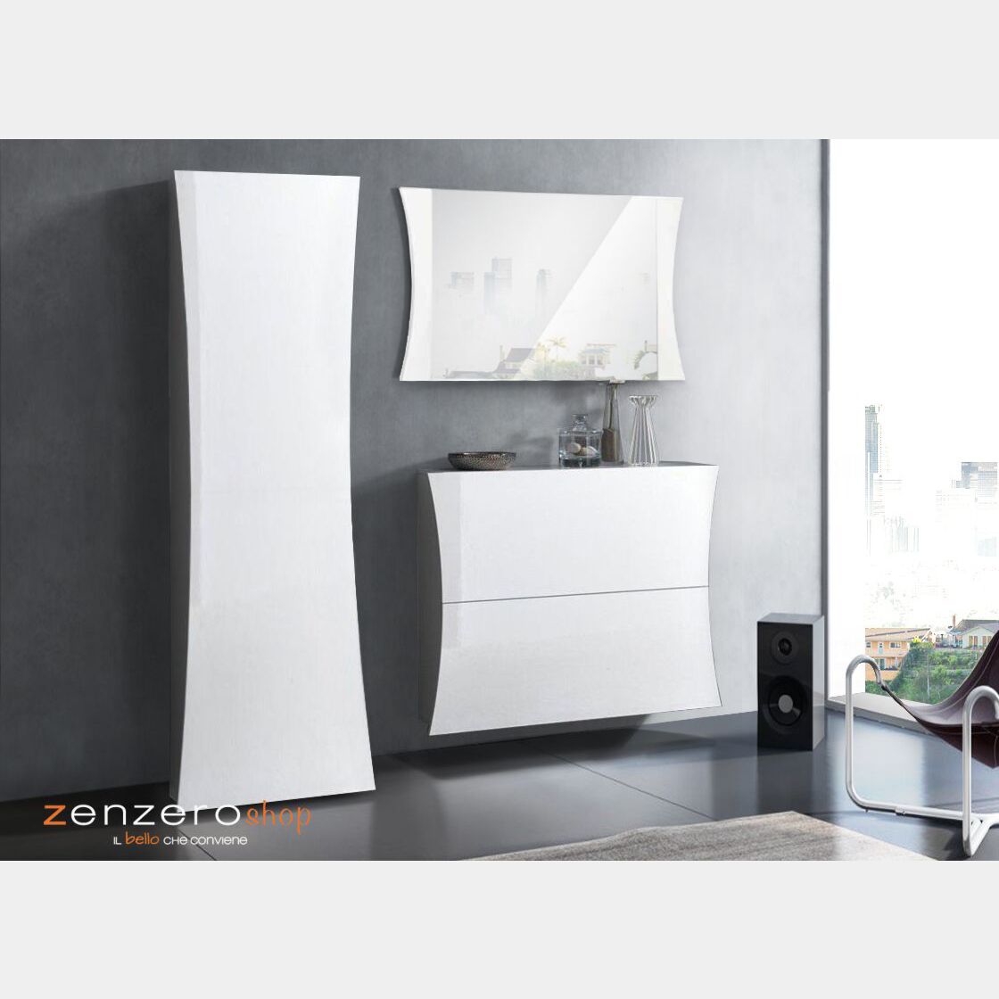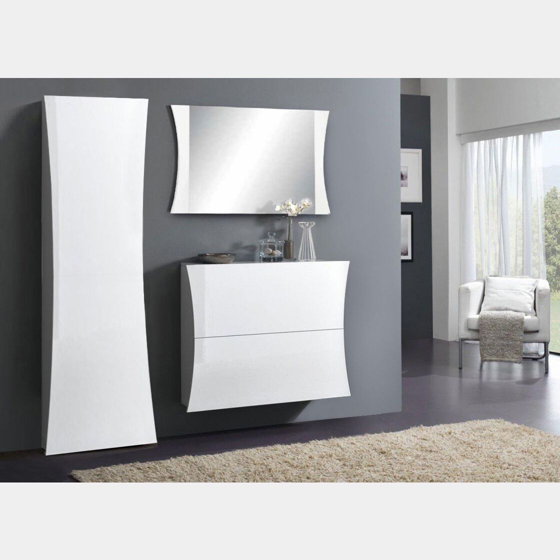 Il mobile d'ingresso curvo è composta da 1 specchiera, 1 armadio e 1 scarpiera a due ante (può contenere fino a 16 paia di scarpe).