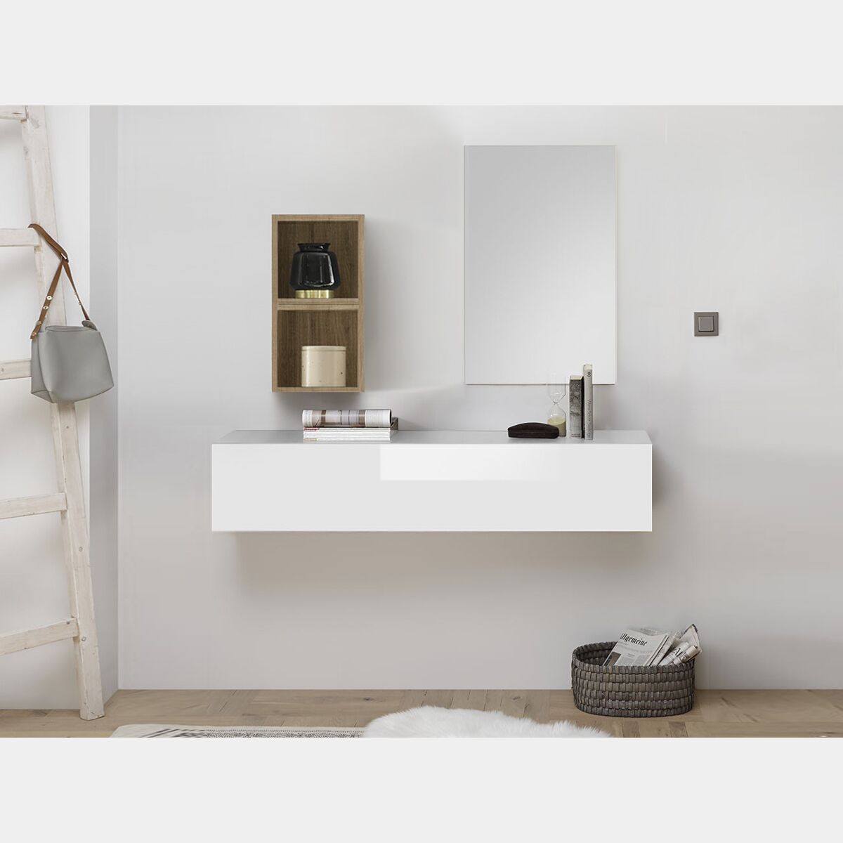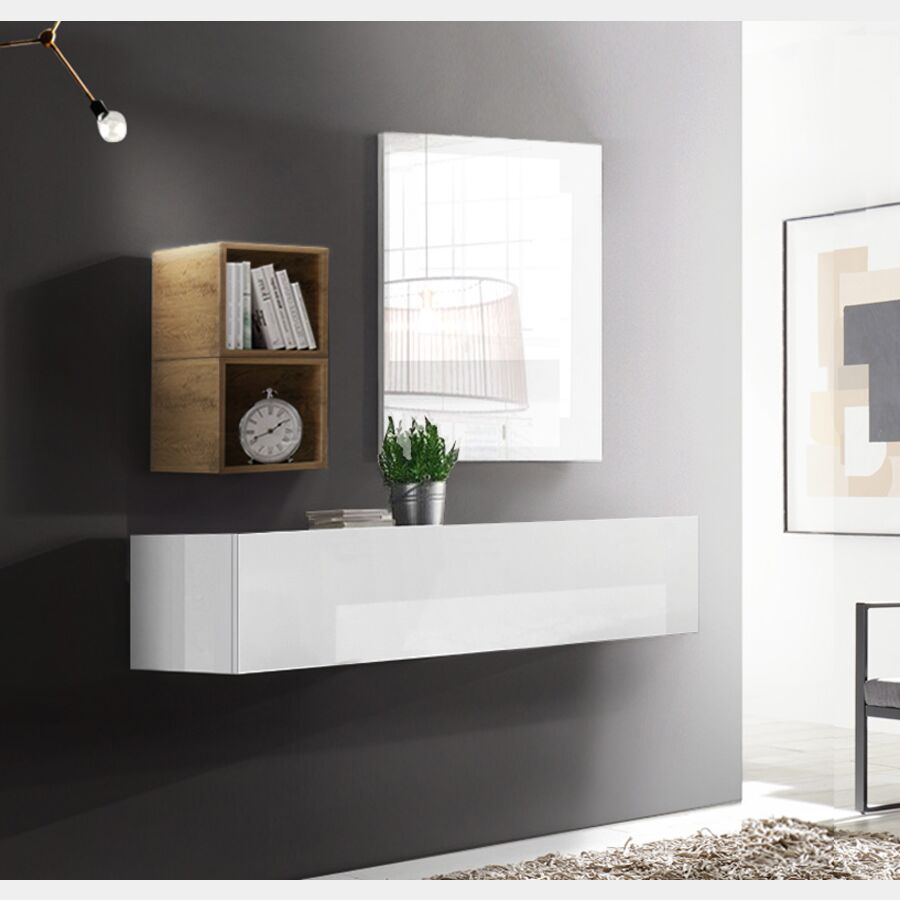 Una ribalta sospesa bianco laccato lucido con apertura a ribalta, 2 vani a giorno in finitura Miele e uno specchio L. 50. Il top della ribalta può diventa una comoda base d'appoggio per diversi oggetti di uso quotidiano.