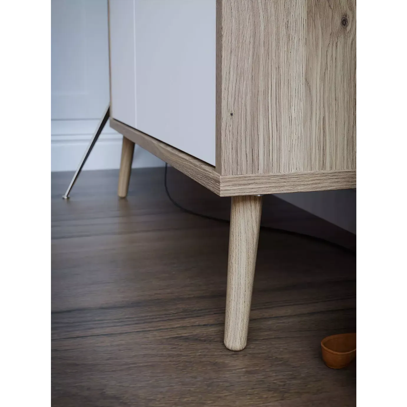 Il mobile da ingresso presenta uno stile nordico, caratterizzato da tratti distintivi come i piedini in legno massello e la calda finitura Rovere.