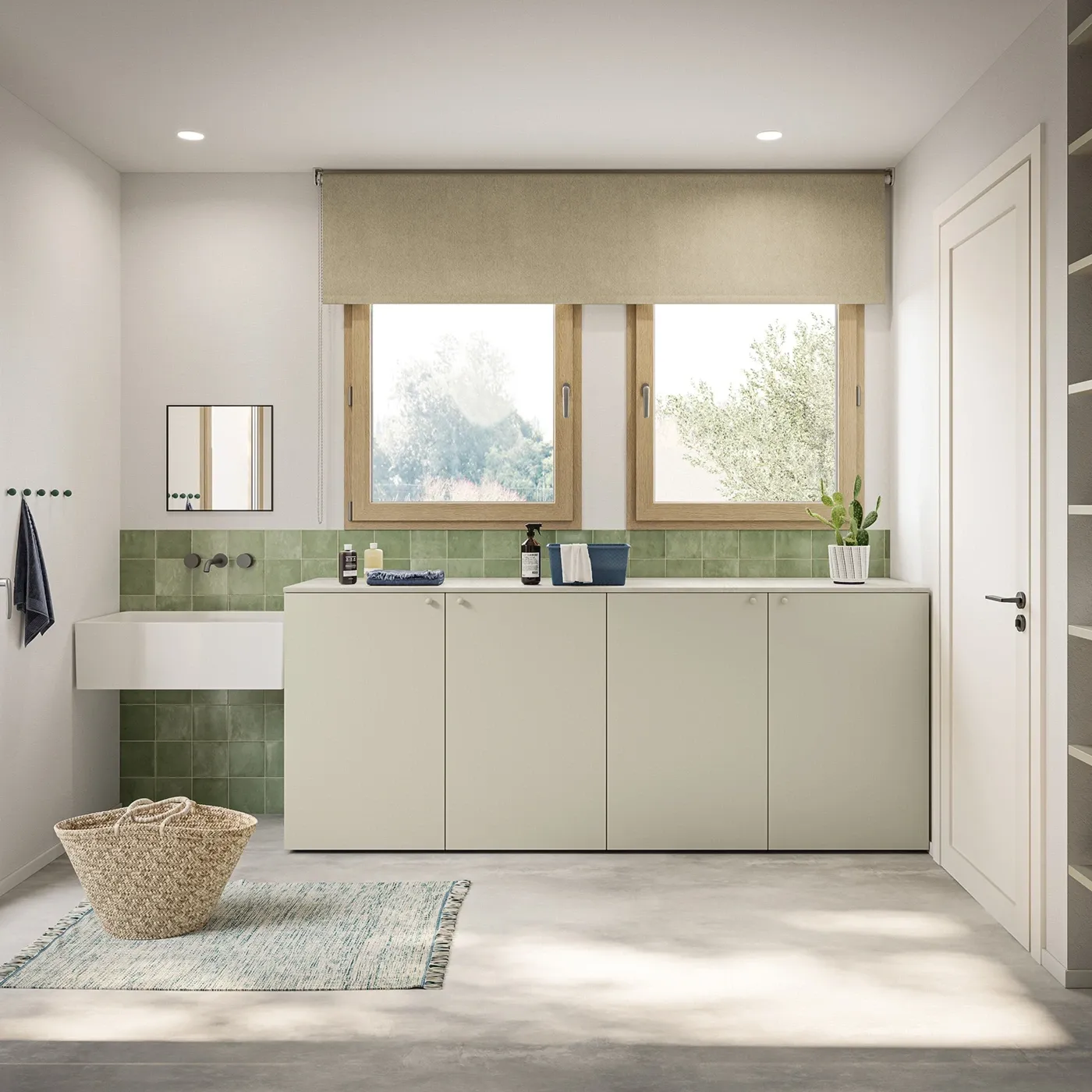 L'armadiatura è bassa e lunga, ha un colore neutro, il Malta, che la rende elegante e discreta.
