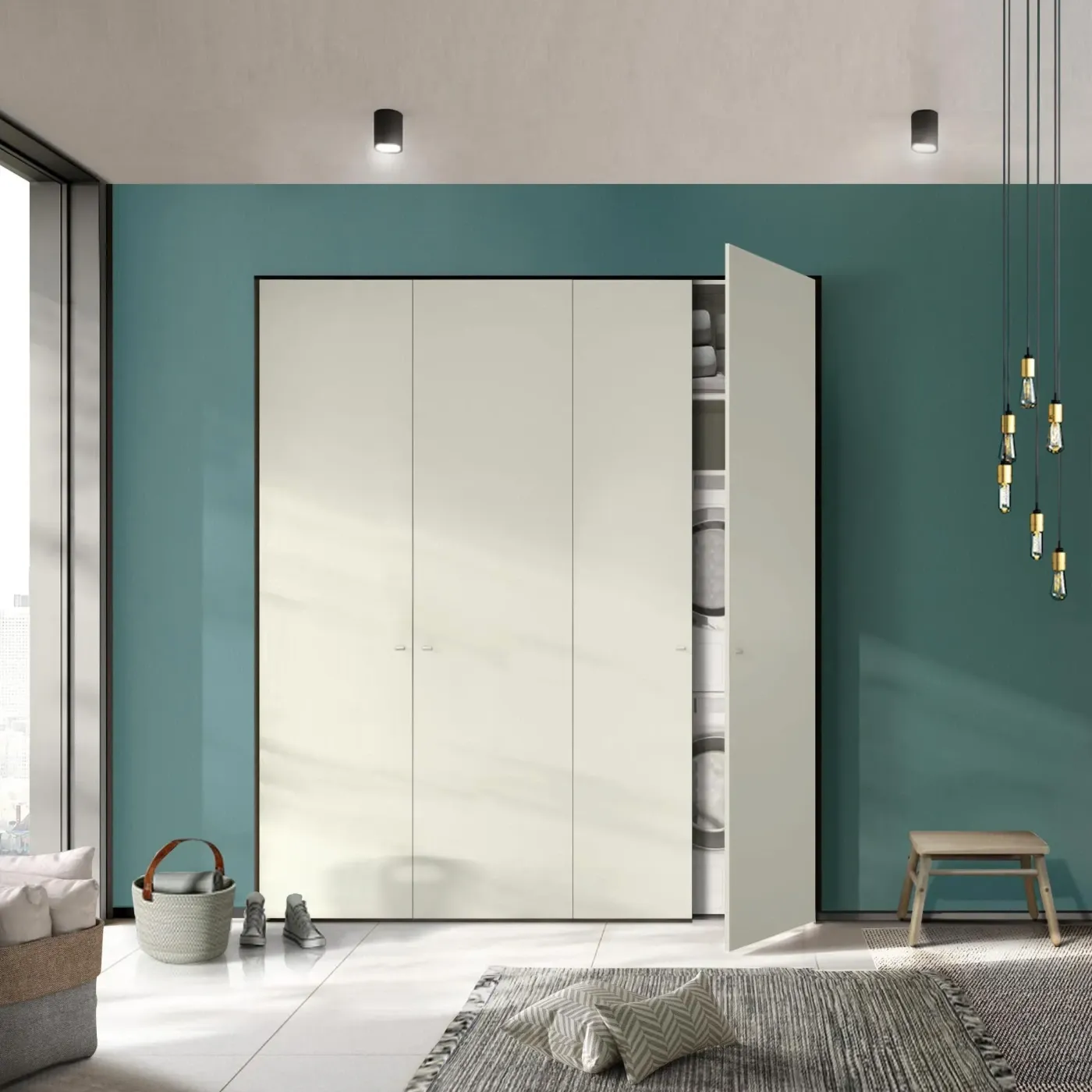Le quattro ante dell'armadio si aprono per rivelare un mondo di spazio e praticità. È di colore Grigio dorian, che lo rende elegante e non appesantisce l'ambiente, adattandosi bene a diversi stili.