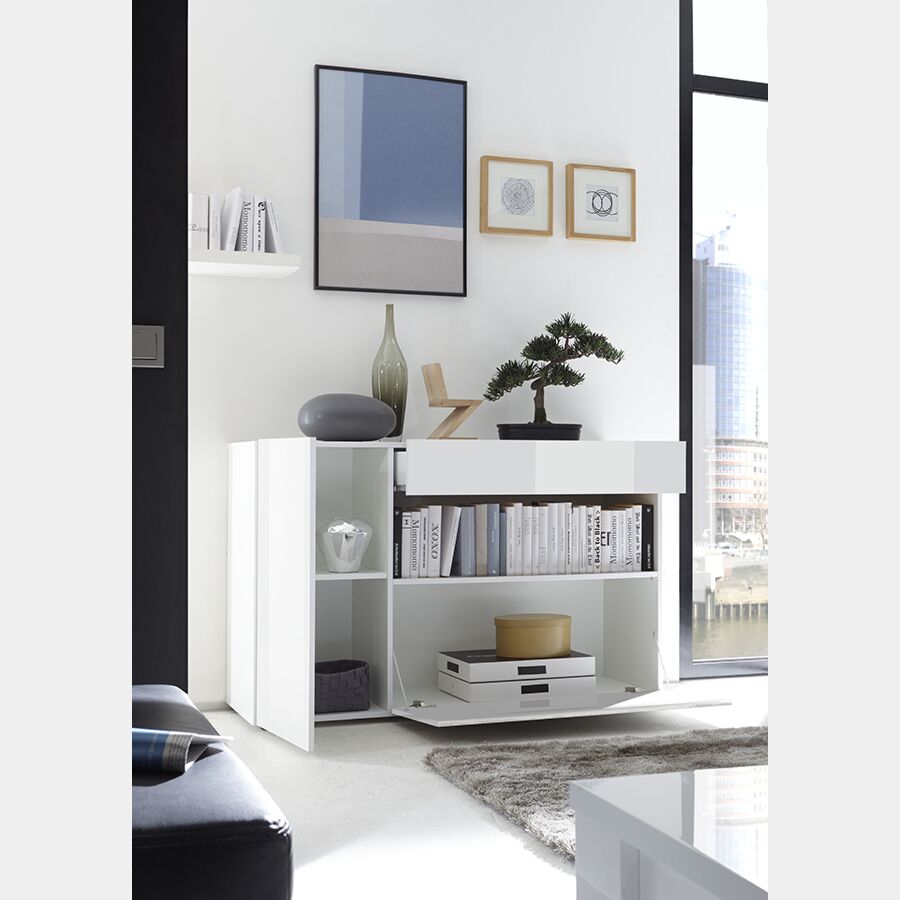 Scocca bianca opaca, 1 anta verticale bianco lucido, cassetto e anta ribalta in finitura Bianca lucida. Melaminico bianco.