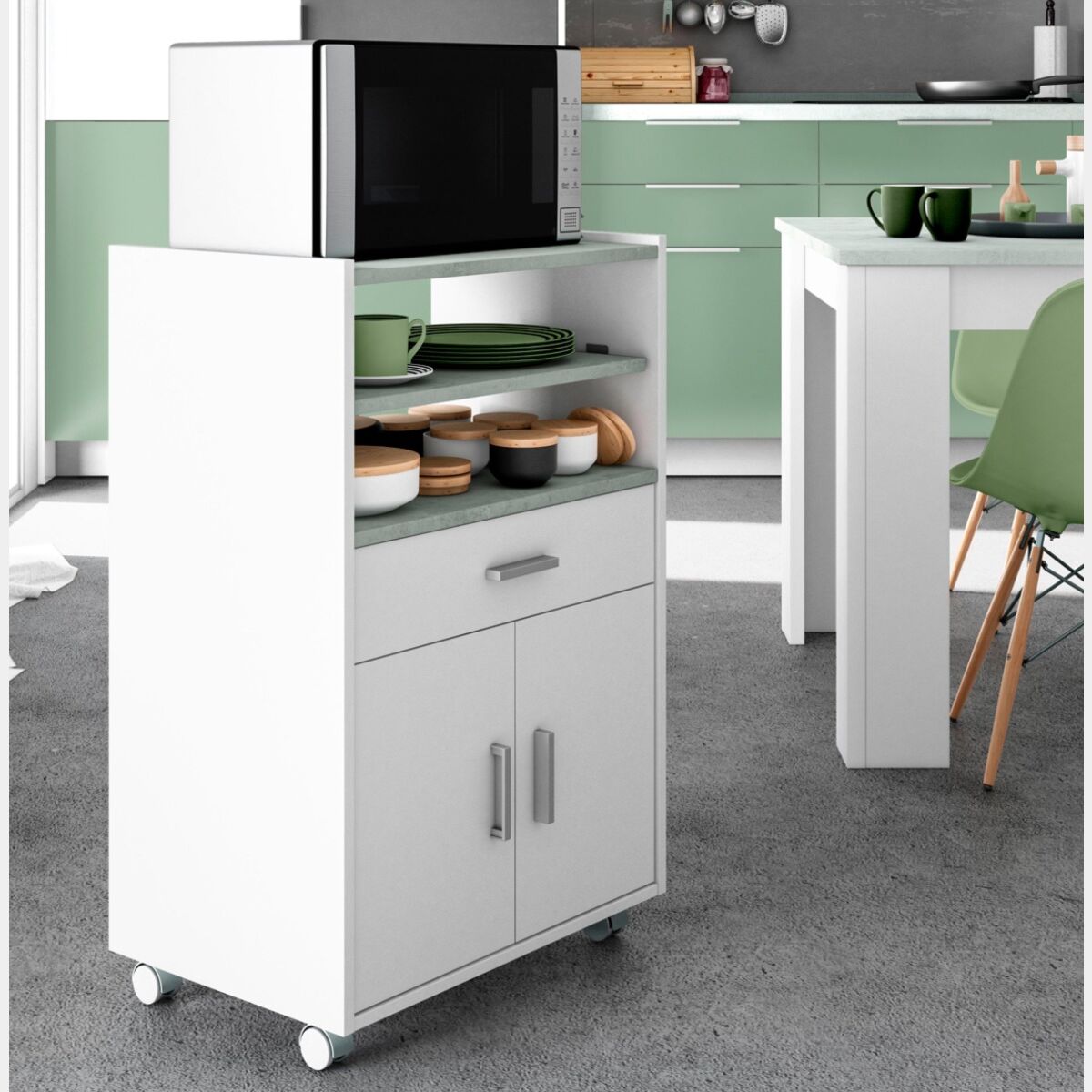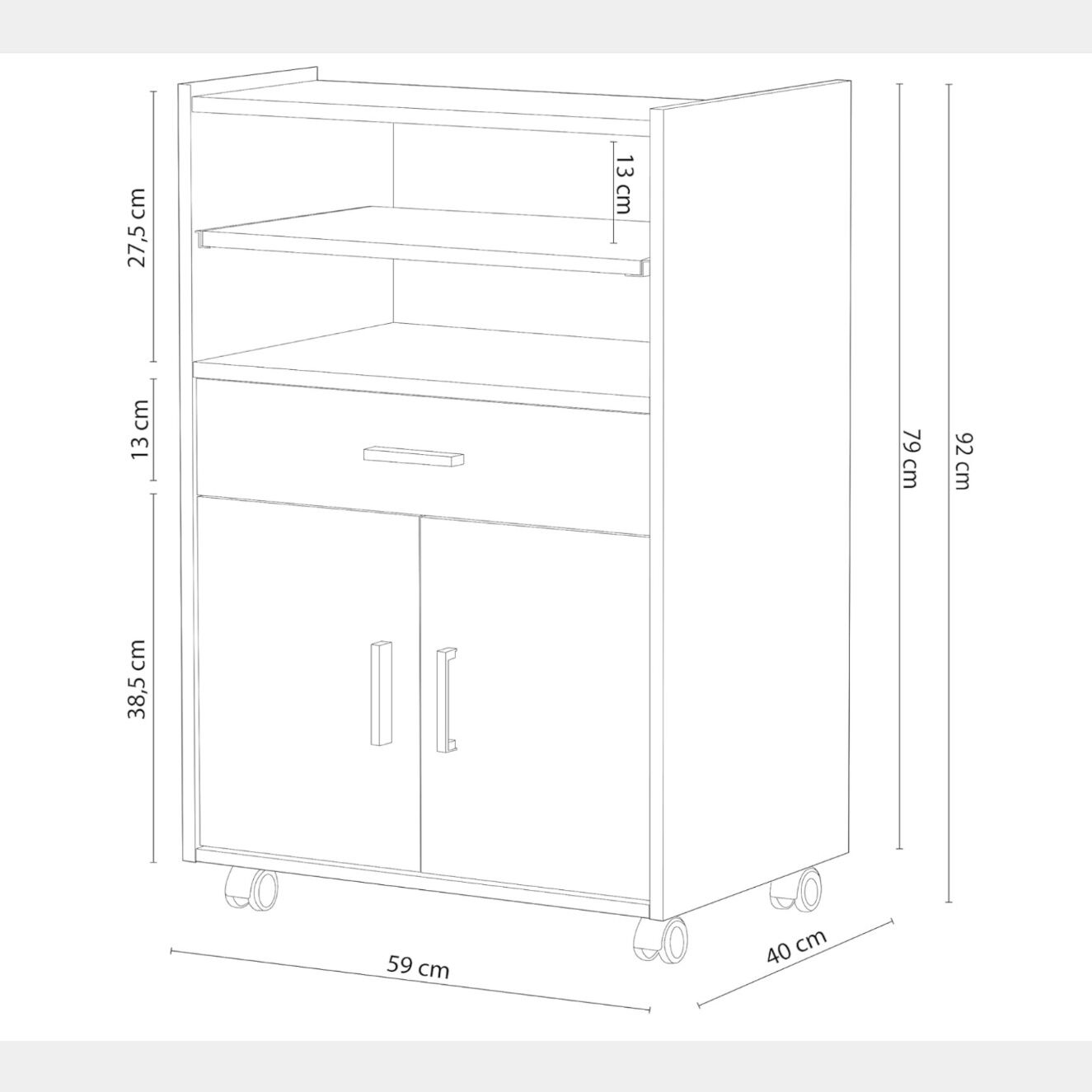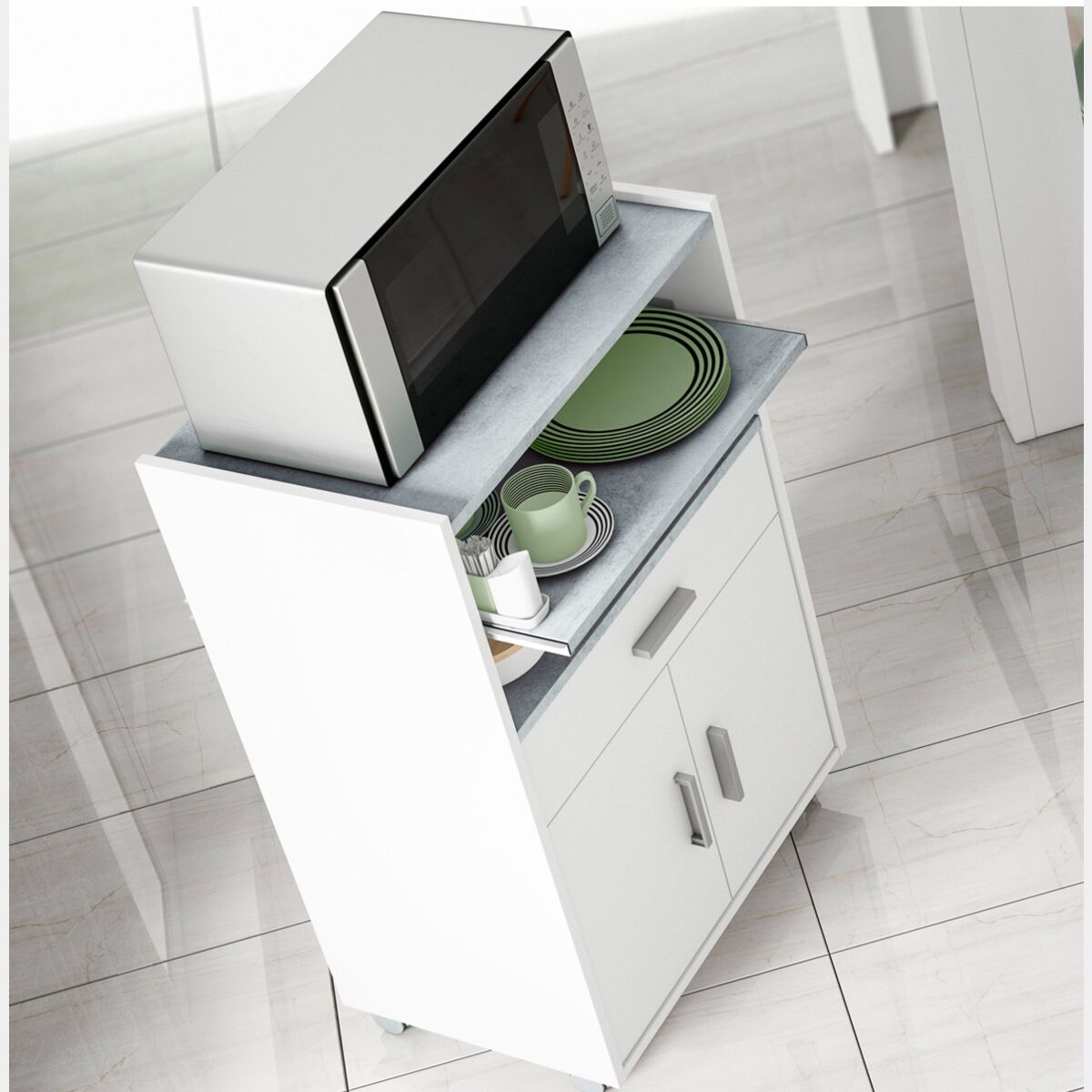 Mobile multiuso per sale da pranzo. Il mobile non è altro che un'unione tra un carrello e un mobile base per cucina. Questa particolare unione crea un mobile multiuso molto versatile, infatti grazie alle 4 ruote è possibile spostarlo e riporlo dove si vuole. Il mobile ha inoltre due ante battenti, un ripiano estraibile un vano a giorno.