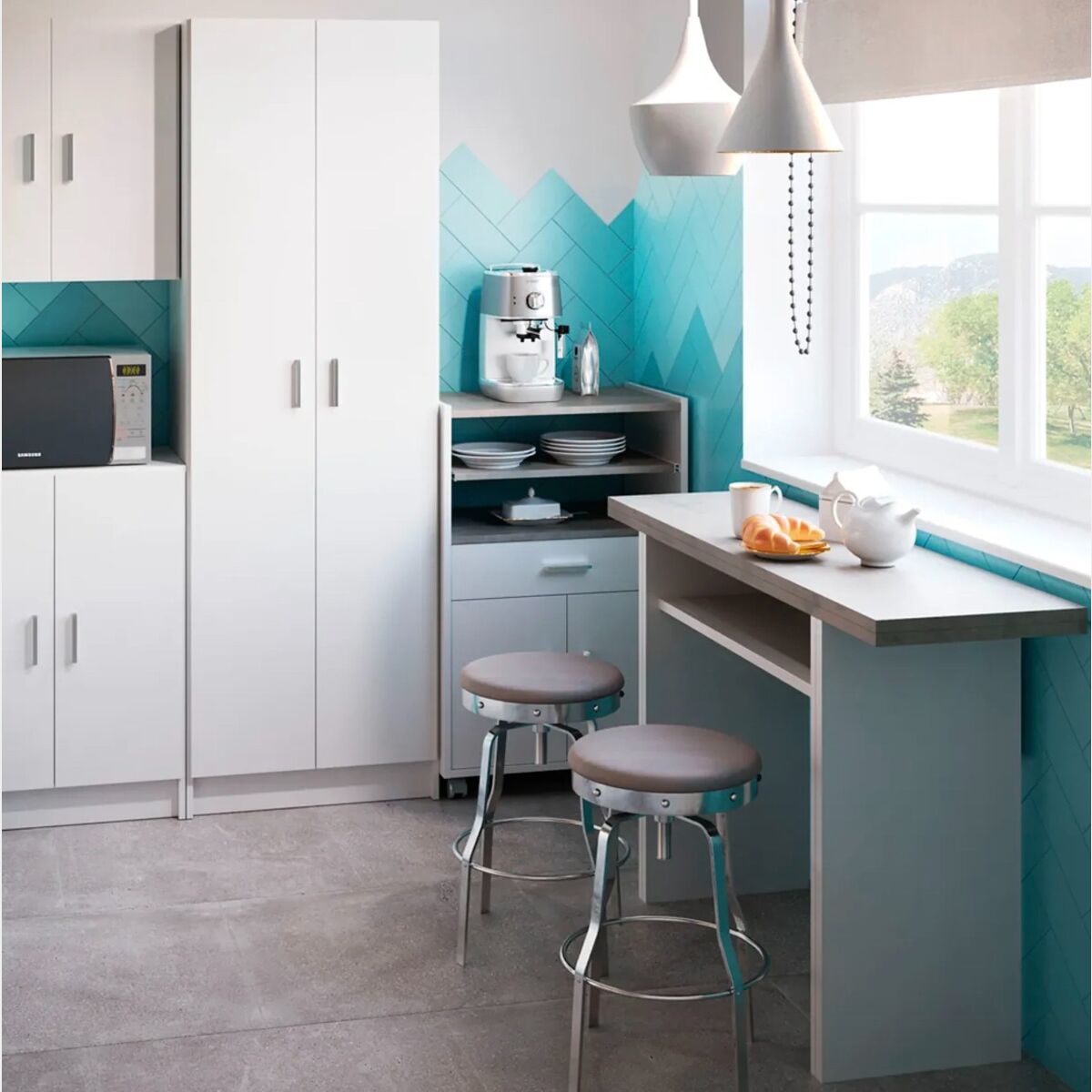 Mobile per cucina con piano ad estrazione, finitura Bianco e Cemento