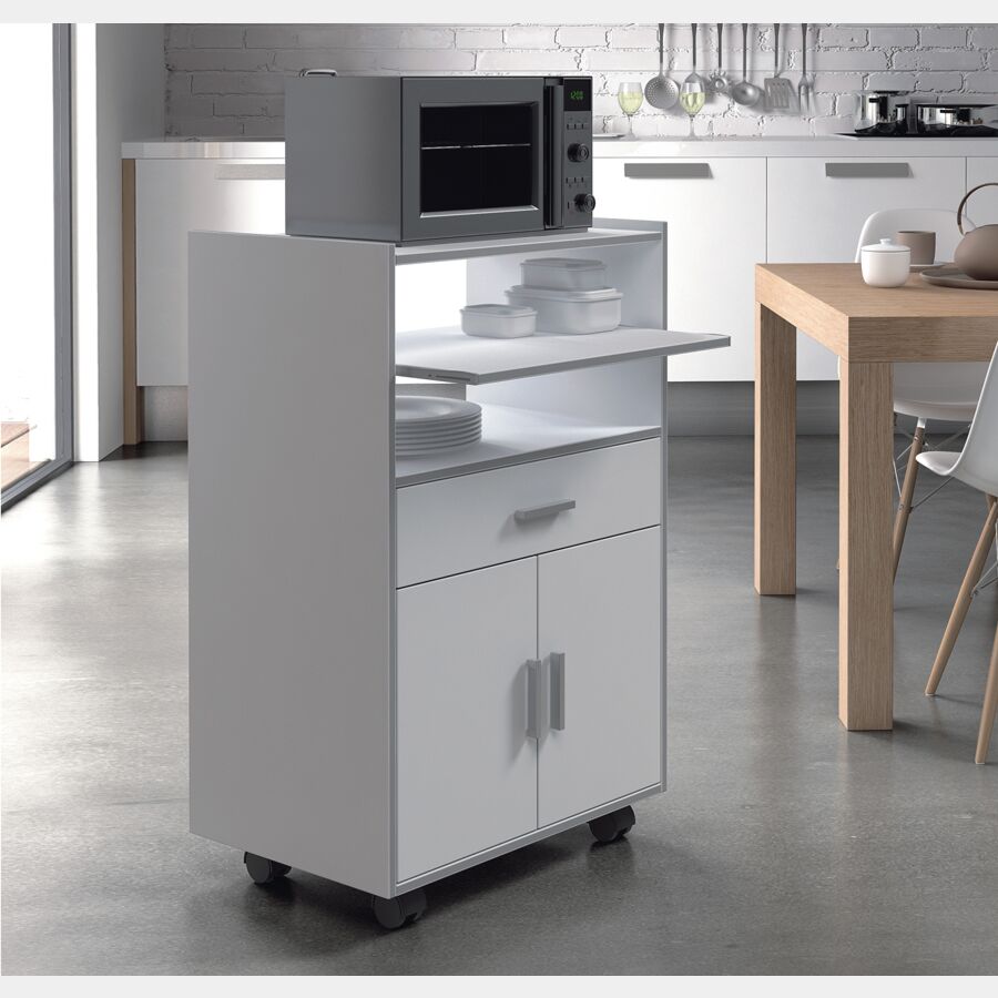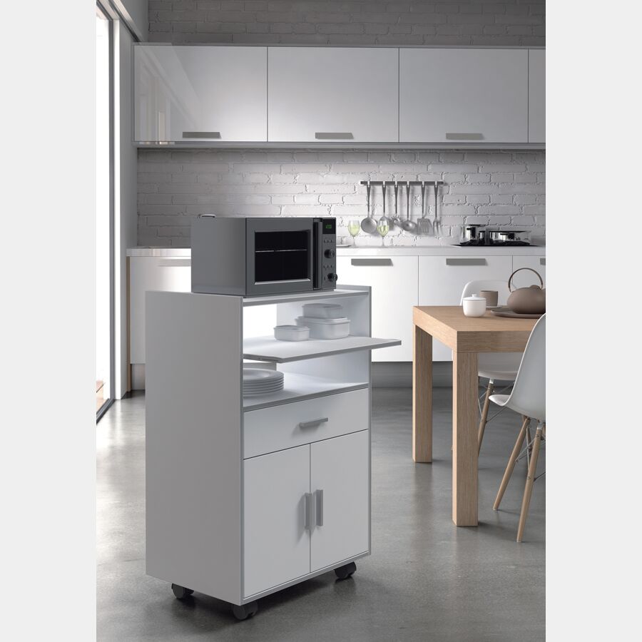 Il mobile non è altro che un'unione tra un carrello e un mobile base per cucina. Questa particolare unione crea un mobile multiuso molto versatile, infatti grazie alle 4 ruote è possibile spostarlo e riporlo dove si vuole. Il mobile ha inoltre due ante battenti, un ripiano estraibile un vano a giorno.