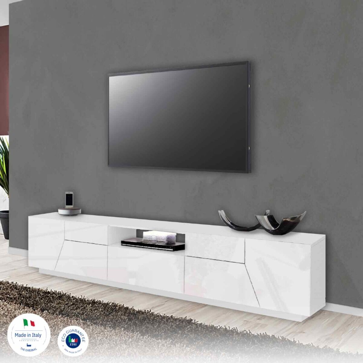 Mobile Porta TV Bianco lucido con 4 ante, un vano a giorno e 1 cassetto, Made in Italy.