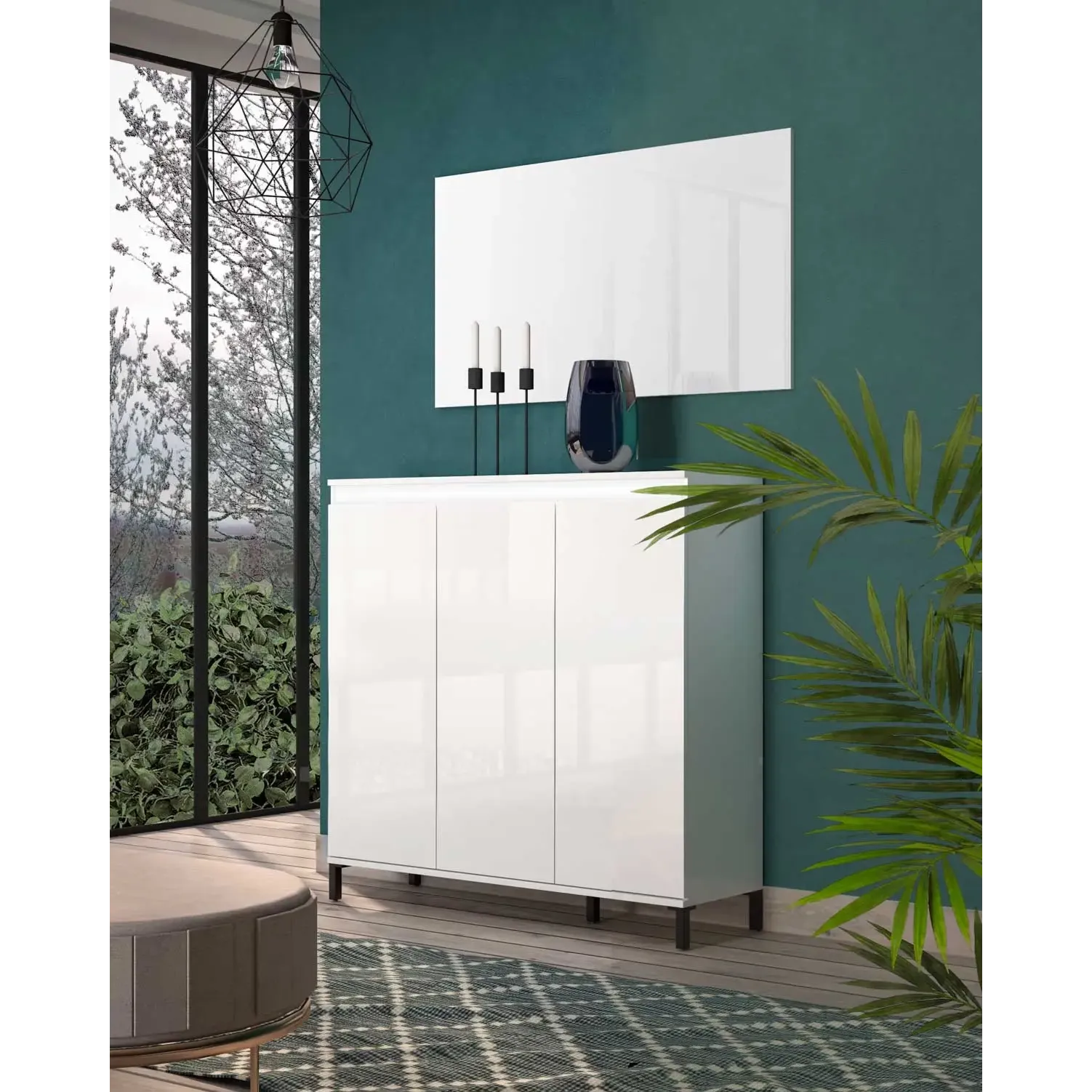 La Madia moderna multiuso a 3 ante colore Bianco lucido renderà i tuoi ambienti moderni e funzionali ed è utilizzabile anche come scarpiera.