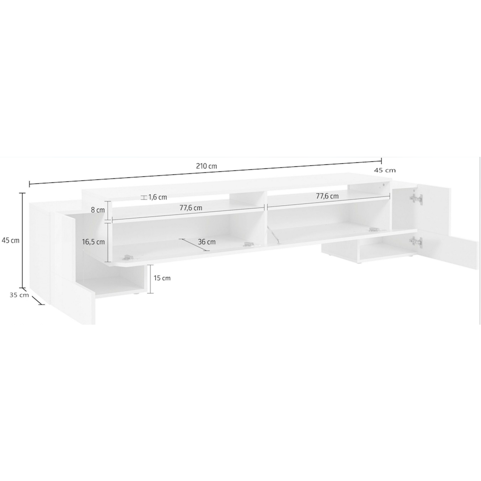 Il mobile tv è dotato di 2 ante laterali che contornano la struttura sospesa e da una ribalta centale. Vi sono inoltre 2 vani a giorno che consentono di posizionare oggetti correlati al porta tv come ad esempio il lettore DVD.