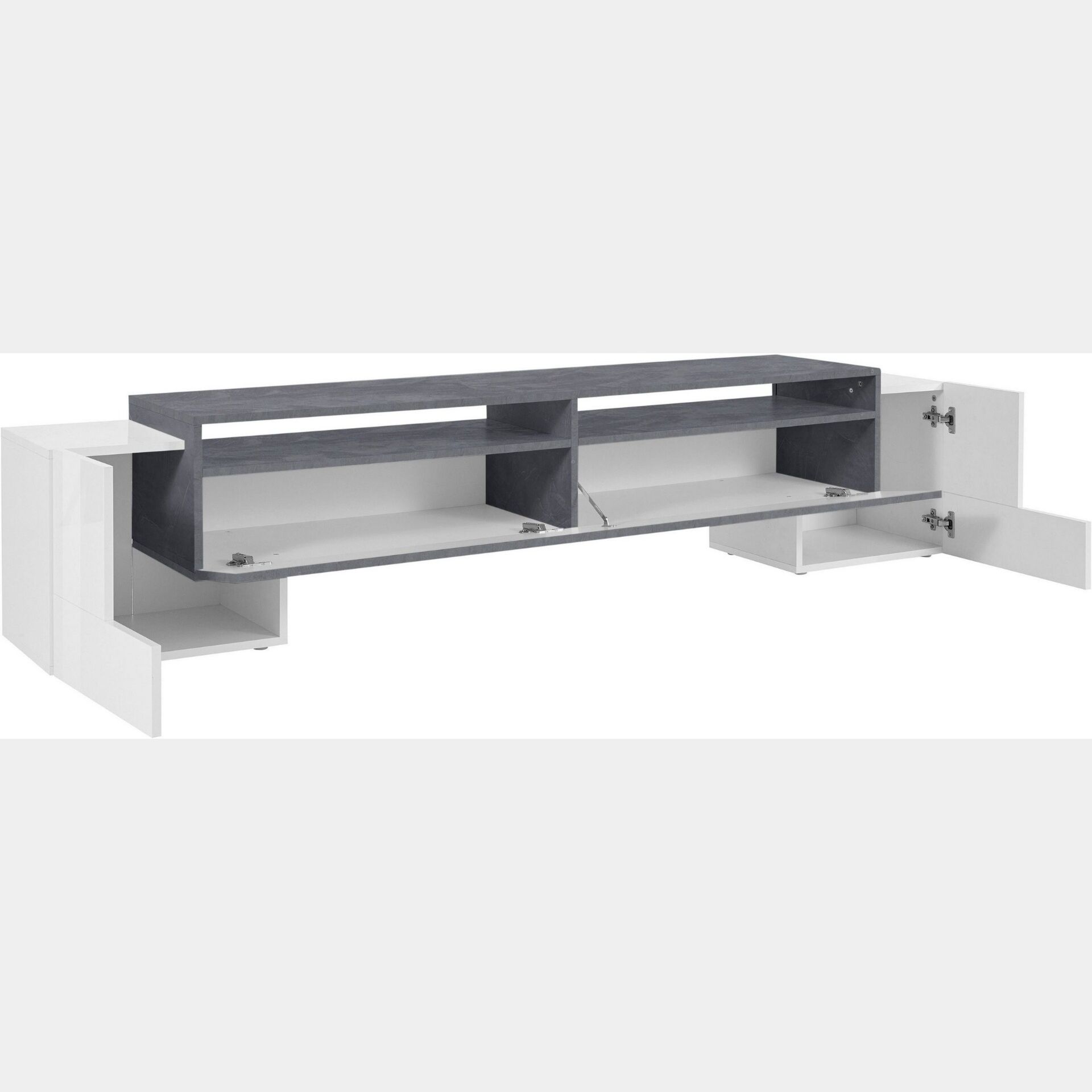 La finitura in Bianco lucido si contrappone alle sfumature dell'Ardesia per donare al porta tv uno stile unico e ricercato. Il mobile è inoltre disponibile nella finitura in Bianco lucido e Pero oppure completamente bianco lucido.