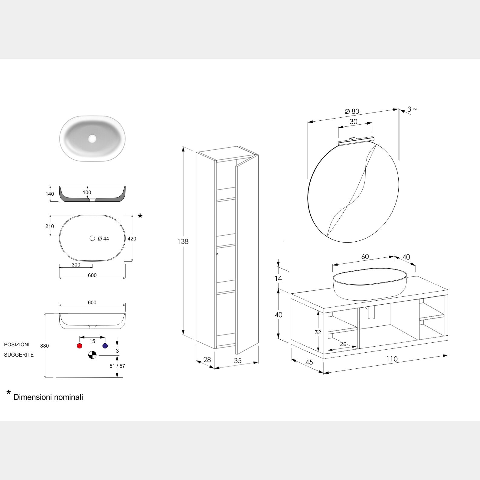 - Specchiera: D.80 Sp.2.8 cm (optional)