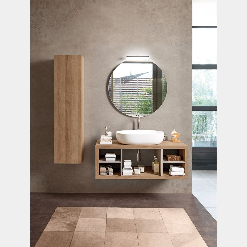 Il mobile da bagno può essere fornito con il lavabo in appoggio in ceramica nella finitura bianco lucido (optional), con specchio supportato da un pannello in MDF nero, con lampada illuminazione Led a basso consumo di energia (optional) e con la colonna verticale a 3 ripiani con chiusura ammortizzata (optional). La consolle viene fornita già assemblata. Piletta, sifone e tasselli non sono inclusi.