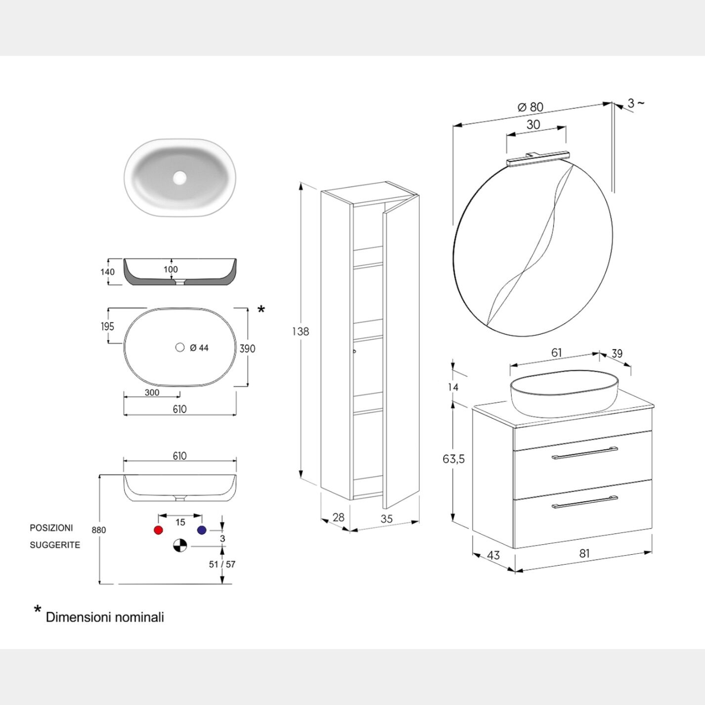 Con il mobile moderno da bagno è possibile richedere il lavabo in appoggio in finitura bianco lucido (optional), lo specchio tondo supportato su pannello struttura in agglomerato di particelle di legno con lamina melaminica in finitura Telato Antracite (optional), la lampada con illuminazione LED a basso consumo di energia, IP 44, 220V (optional), la colonna laterale dotata di 3 ripiani interni con meccanismo di apertura/chiusura ammortizzata.