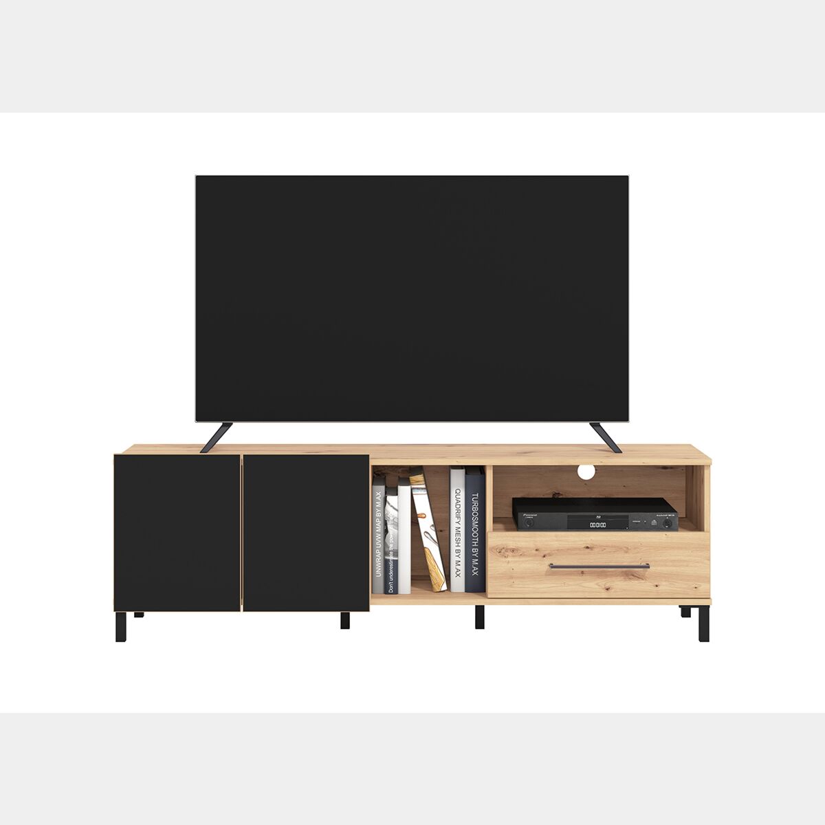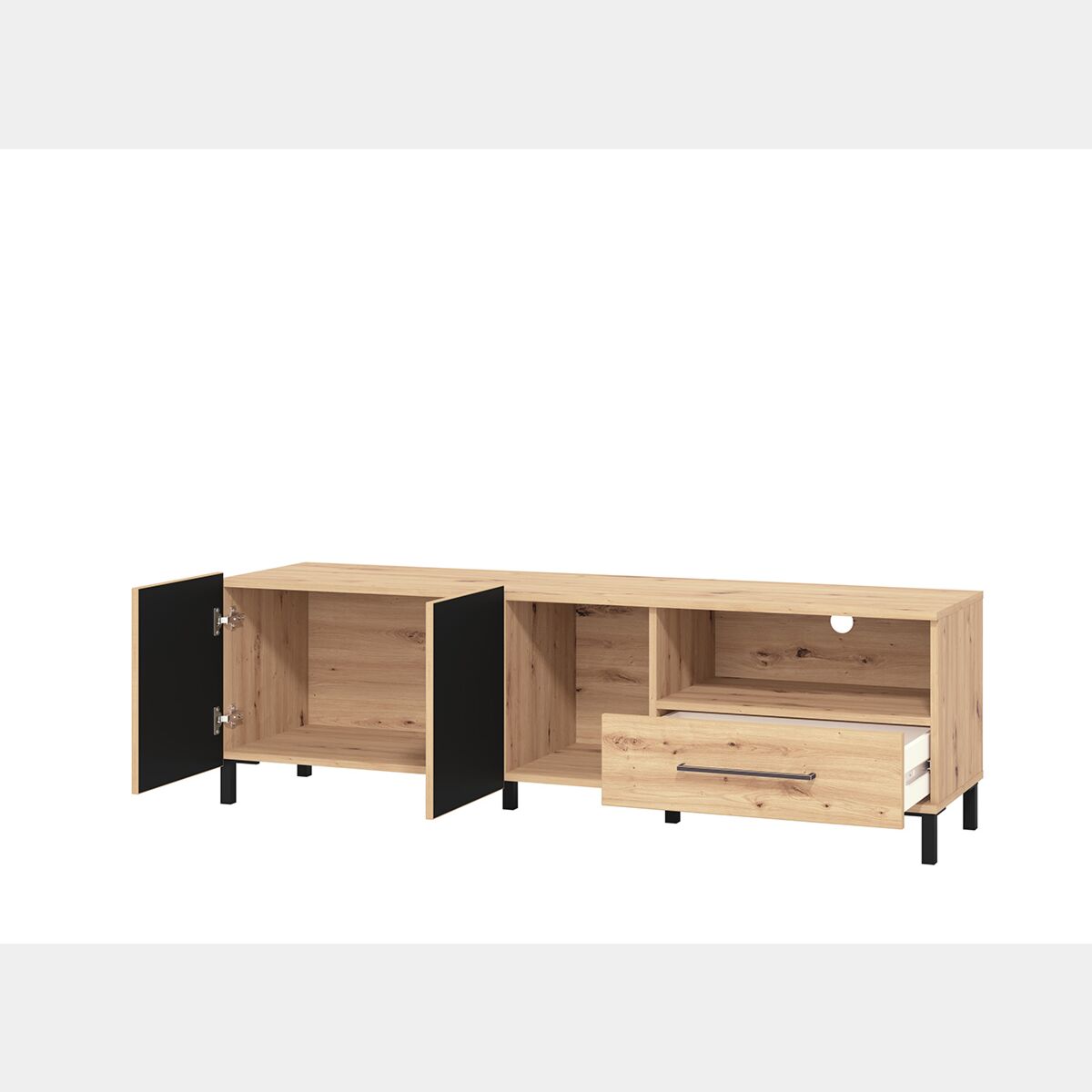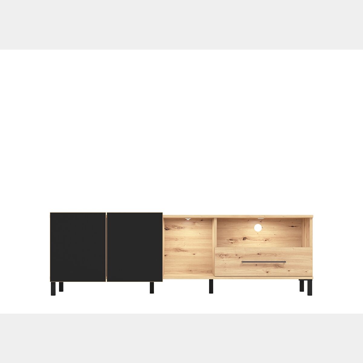 Mobile tv 160 cm con cassetto e due ante, finitura Rovere e Nero opaco