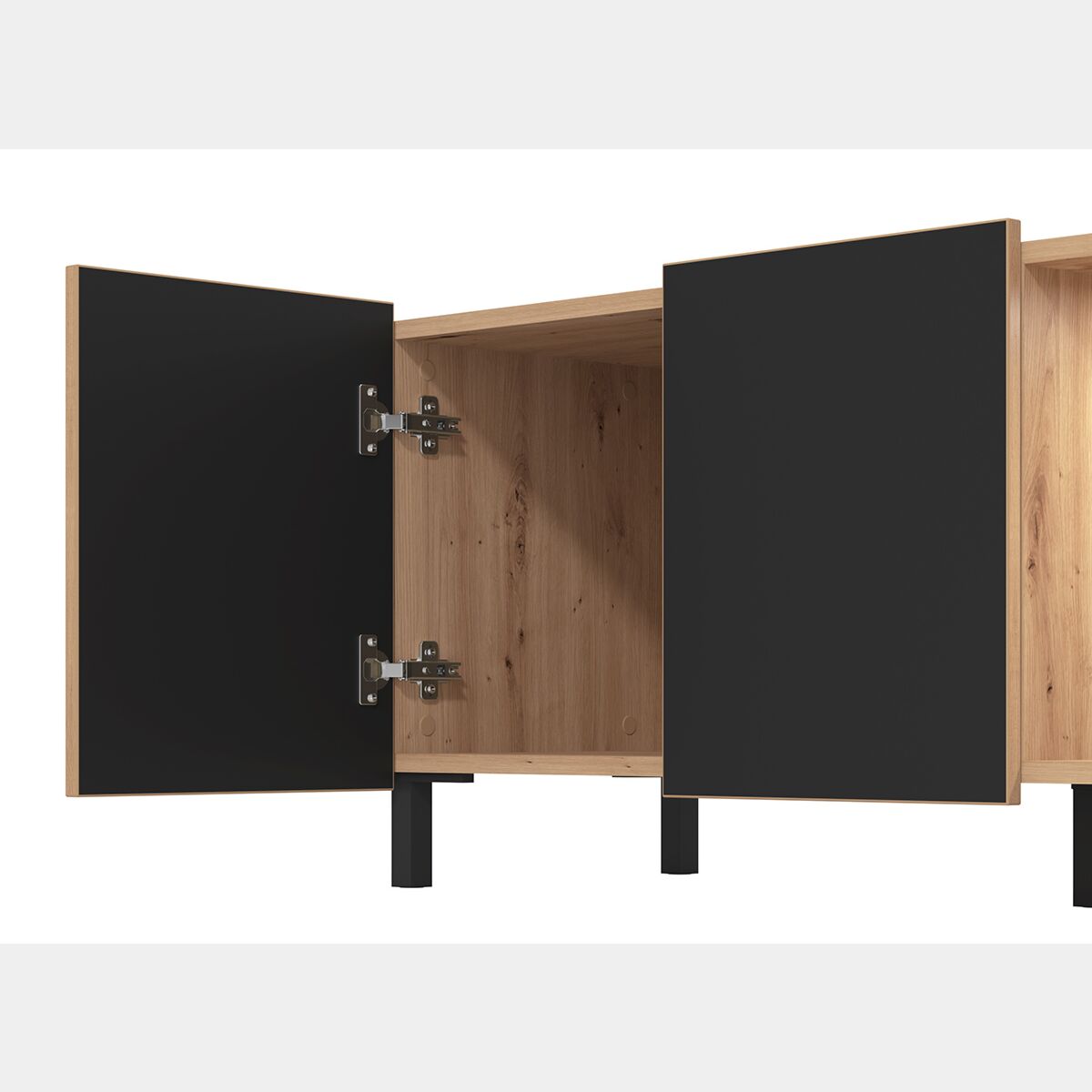 Dettagli accuratamente selezionati caratterizzano il mobile tv per poter offrire una soluzione d'arredo moderna e caratteristica, capace di adattarsi a living ed open space di design. Le caratteristiche finiture in Rovere e nero, la sottile maniglia ed i piedini nero diventano elementi ricercati che donano al mobile uno stile industry.