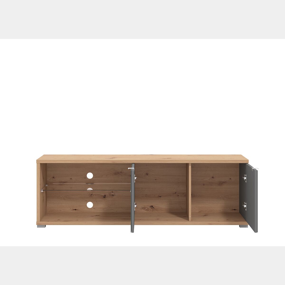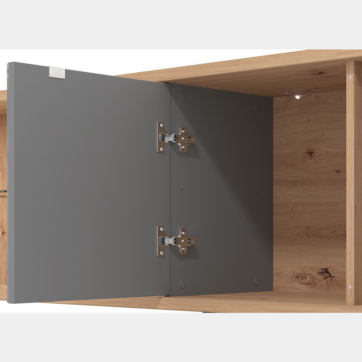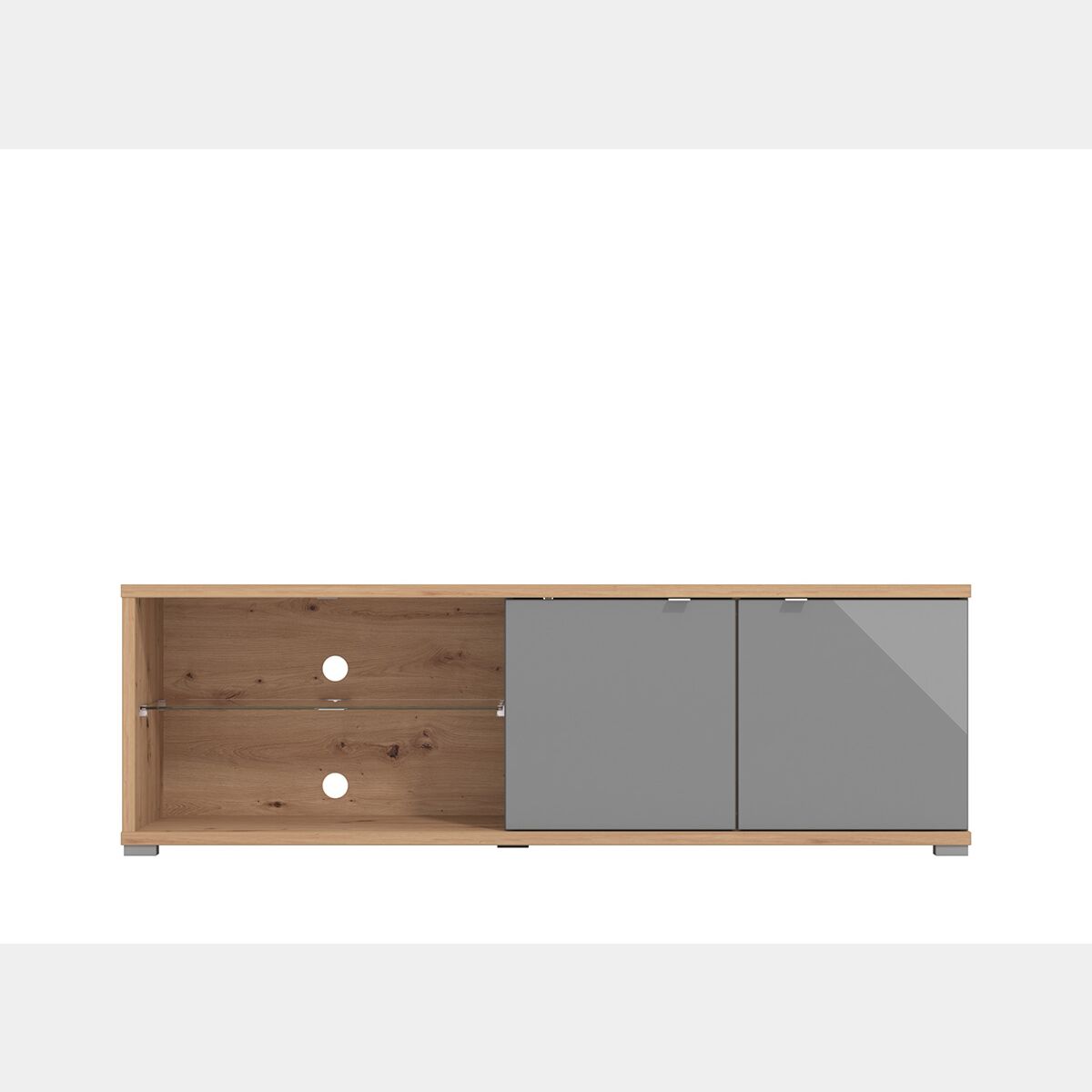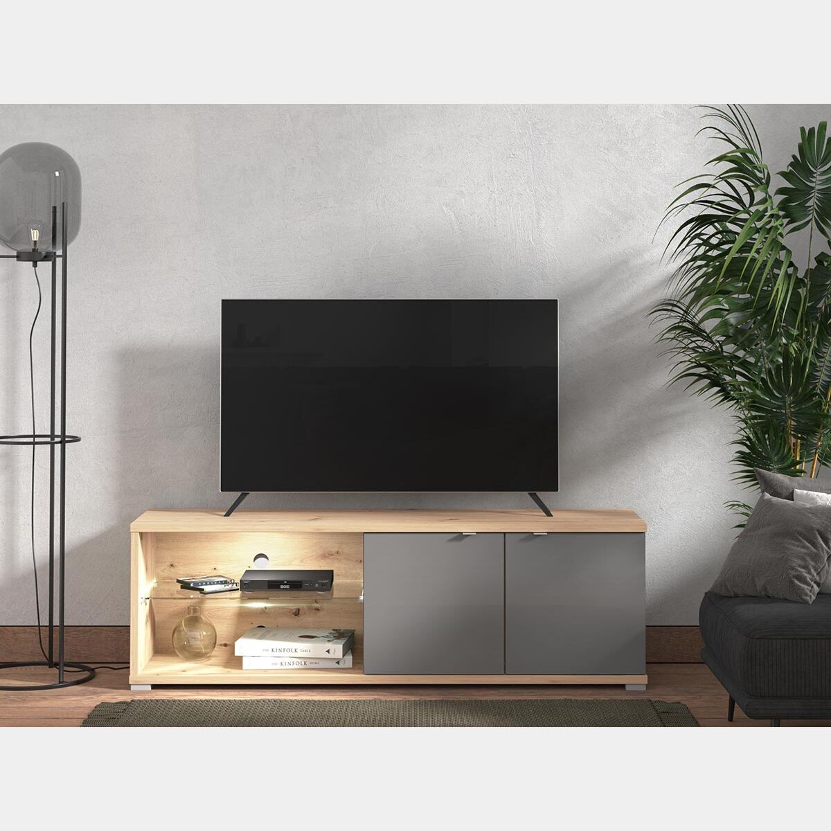 Mobile tv 2 ante e ripiano vetro, finitura Grigio grafite e Rovere