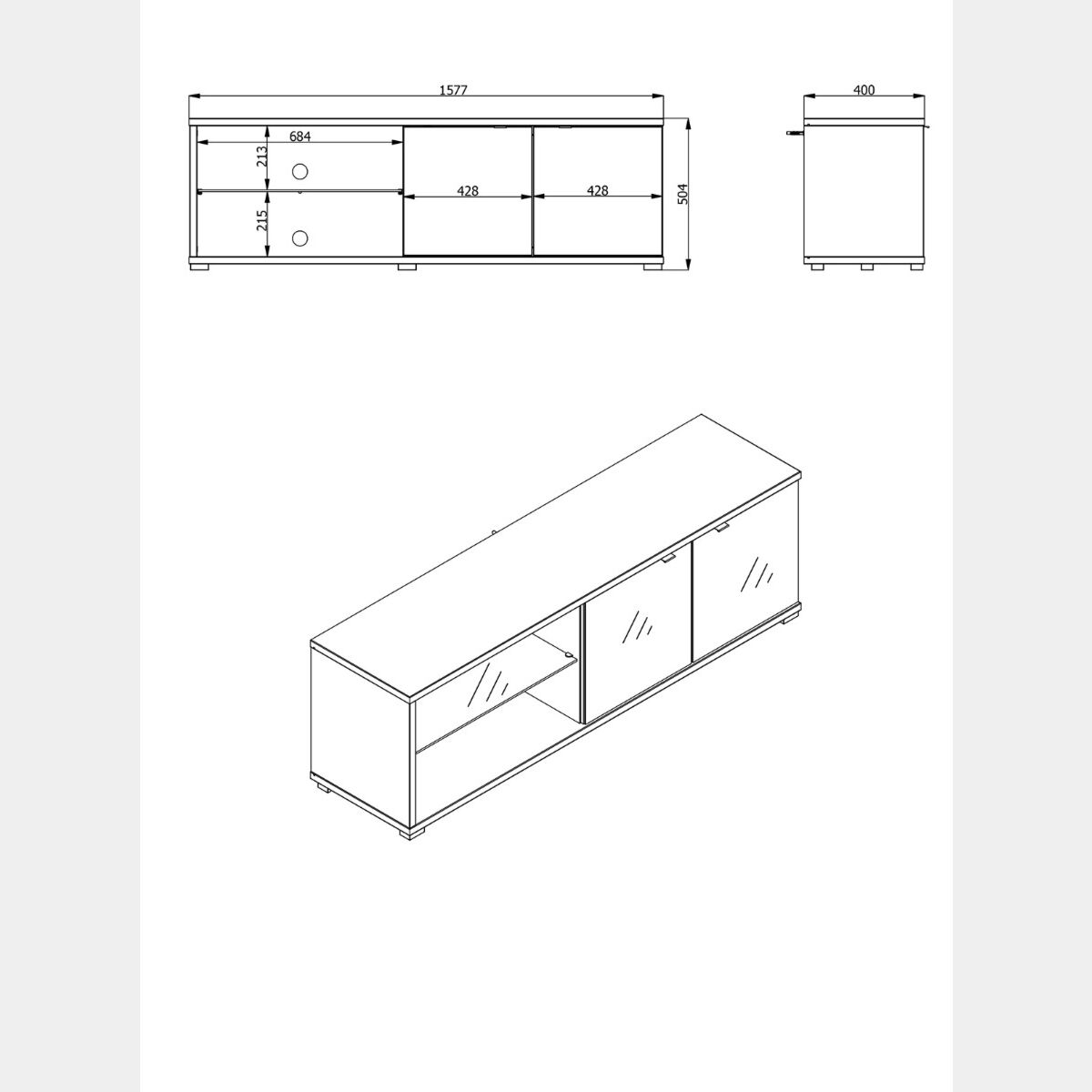 Il mobile porta tv è dotato di un ripiano centrale in vetro che crea due vani a giorno cui è possibile inserire la luce led, gli schienali sono dotati di fori passacavi. Sulla destra si trovano ante dotate di piccole maniglie in alluminio che riprendono i piedini squadrati.