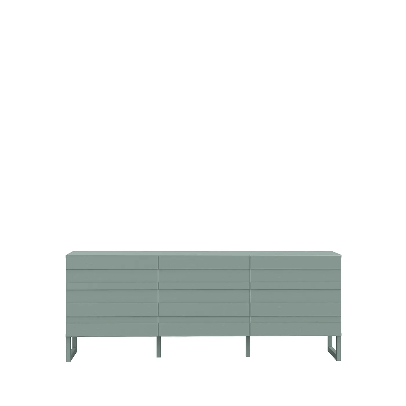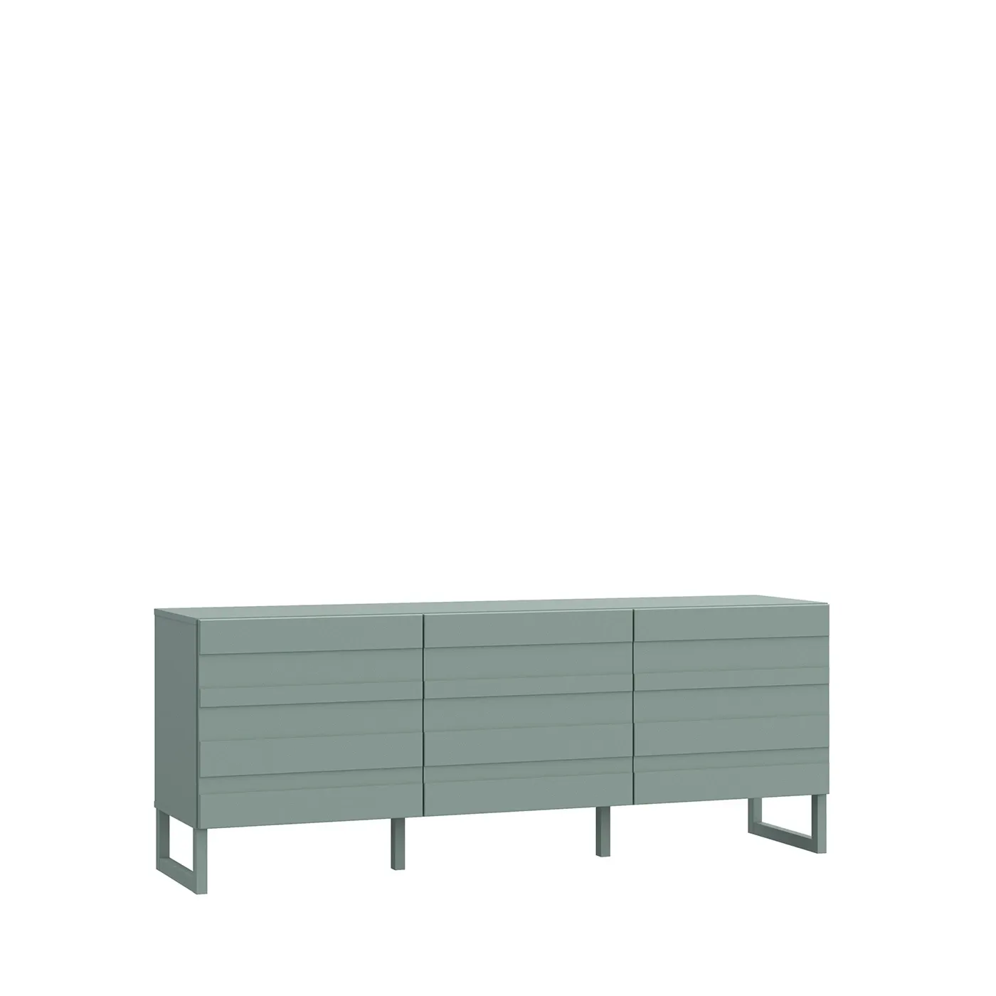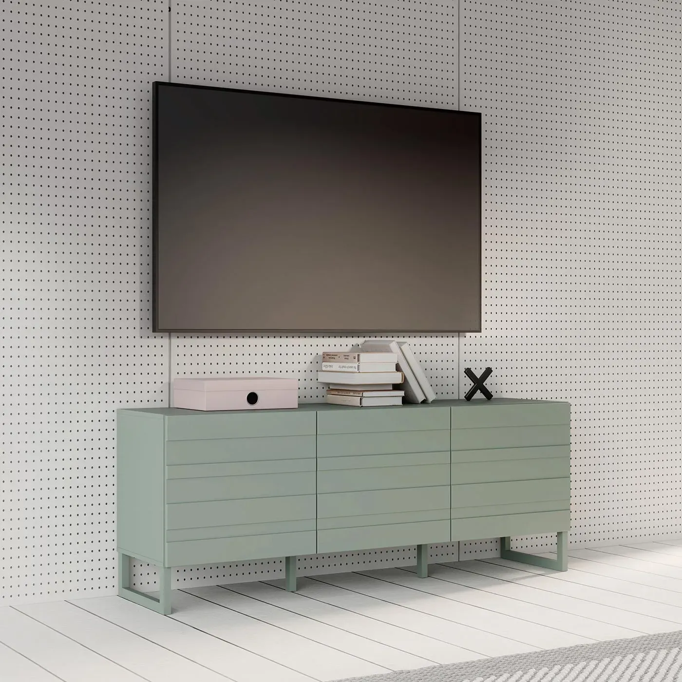 Il mobile porta tv presenta un design moderno e leggero, caratterizzato da decorazioni in rilievo nei frontali e assenza di maniglie.