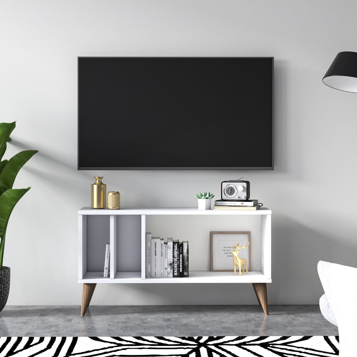 Il porta Tv presenta un design semplice e funzionale: la struttura in bianco è dotata di 2 divisiori che creano 3 vani utili per posizionare oggetti relativi alla tv ma anche soprammobili, libri e souvenier.