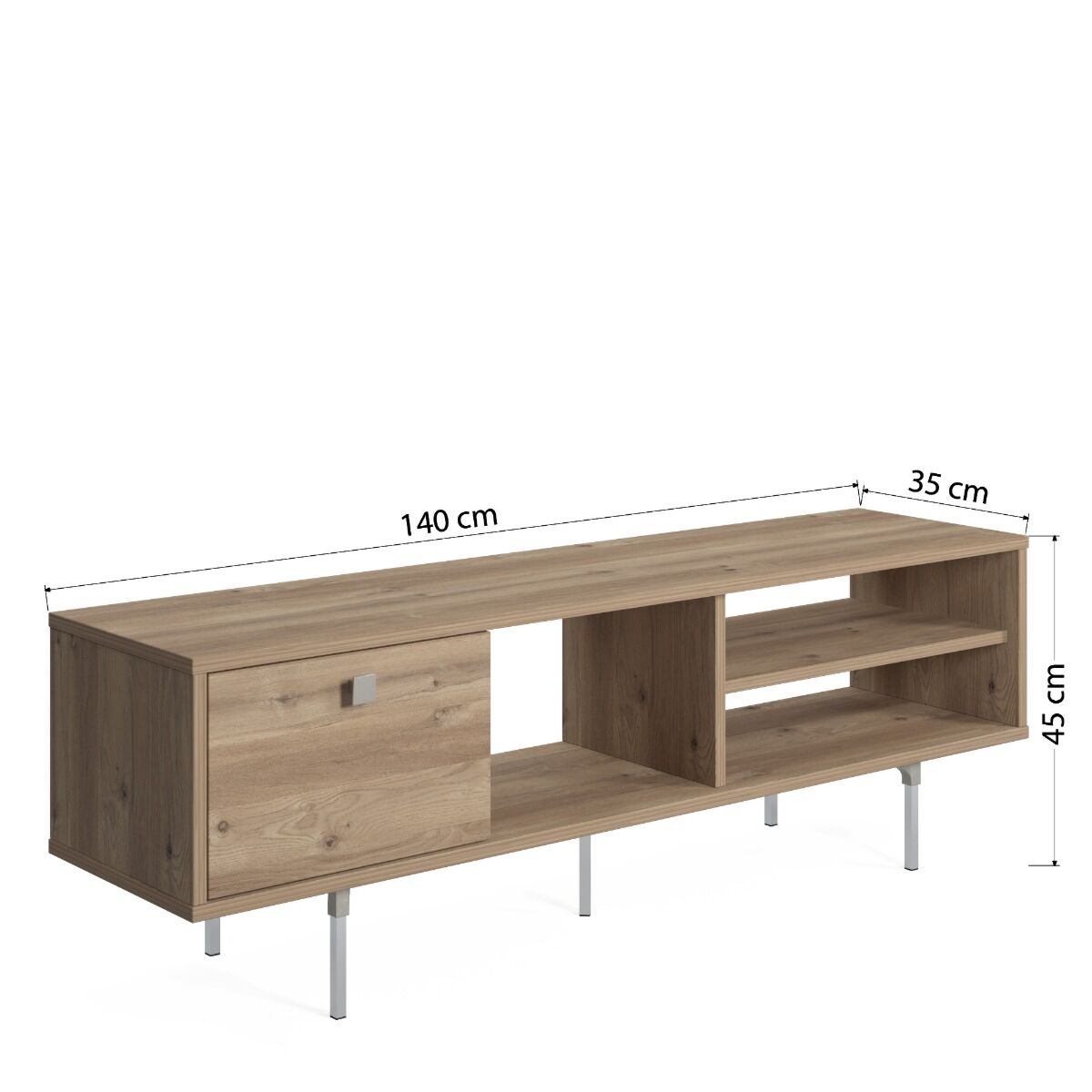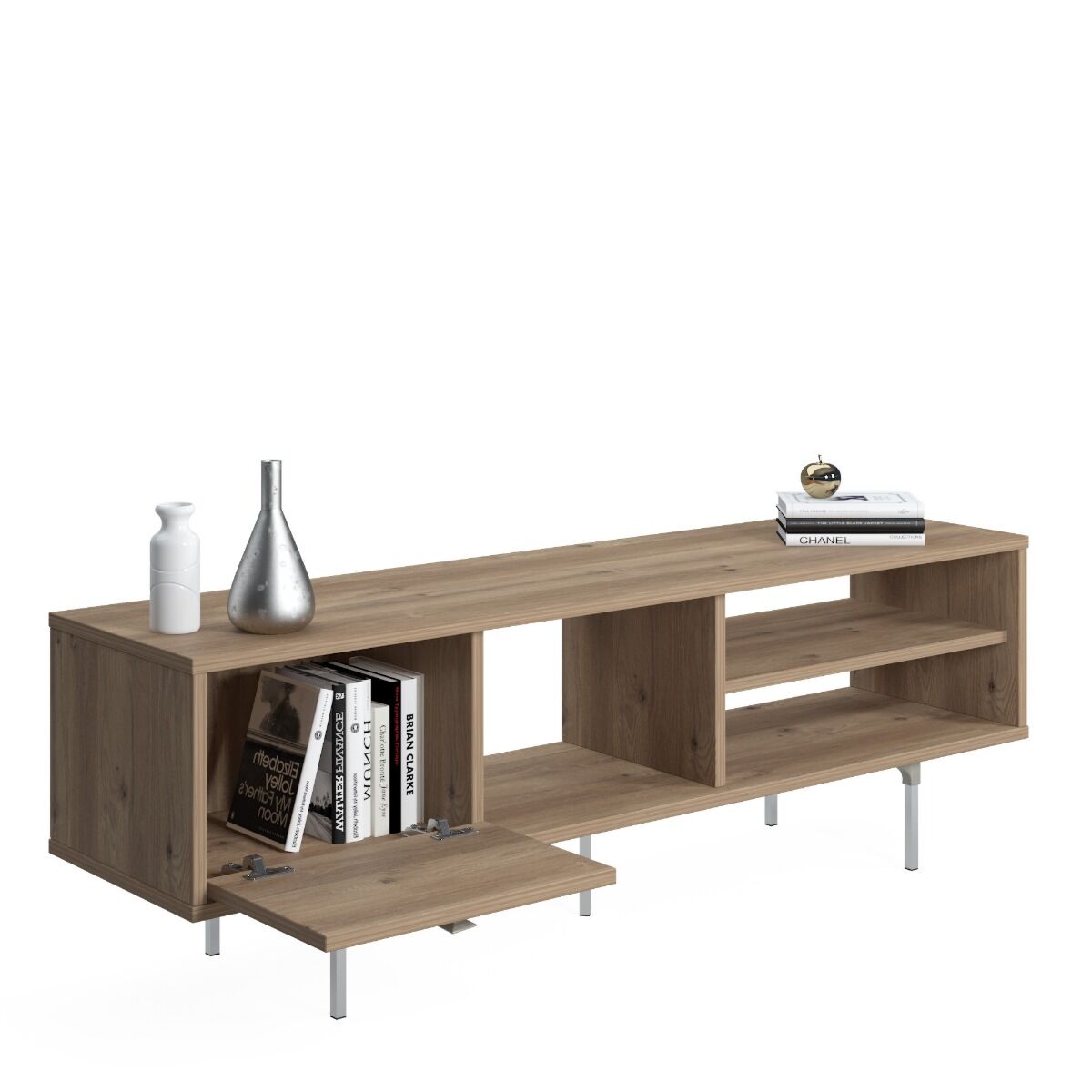 Il porta tv è formato da una ribalta sulla sinistra, un vano a giorno centrale e sulla destra un ripiano che crea 2 spazi di appoggio. Grazie alle sue dimensioni risulta poco ingombrante e molto pratico.