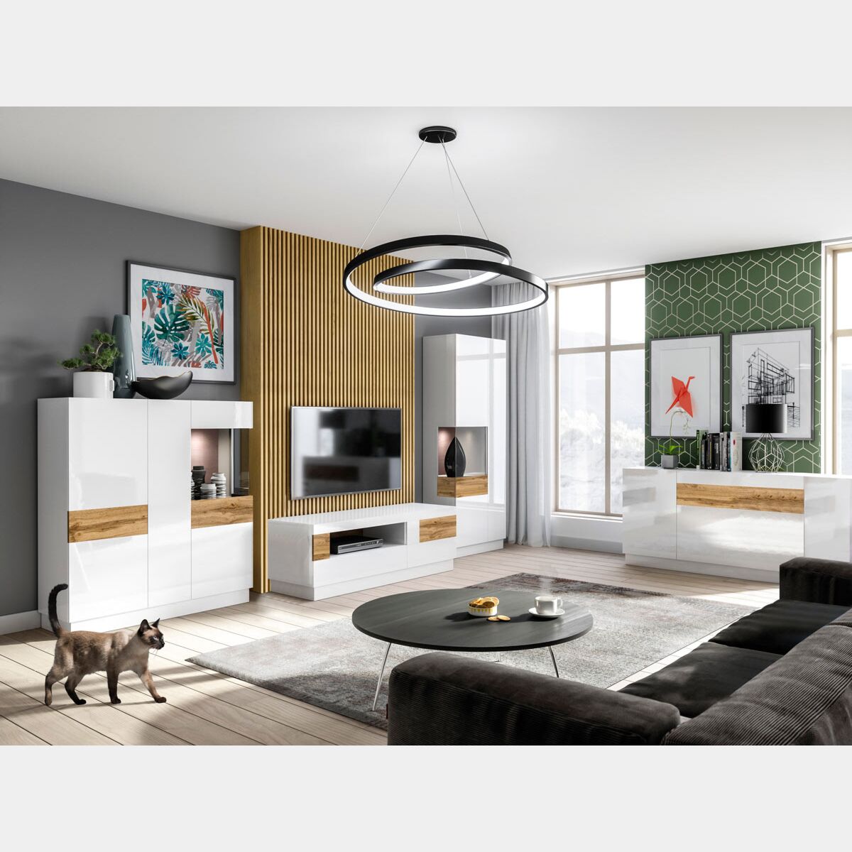 Questo porta TV è caratterizzato dal particolare abbinamento di due finiture opposte ma complementari: la modernità del bianco lucido con il classico effetto rovere, creano un contrasto armonico e innovativo.