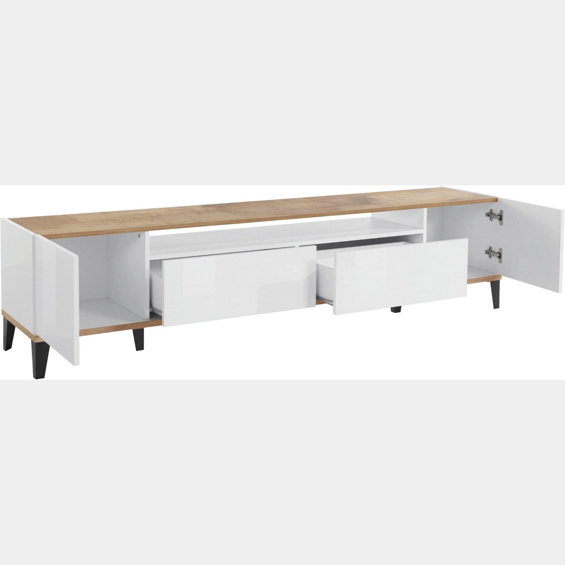 La finitura proposta del porta Tv è Bianco lucido, di tendenza negli ultimi anni, che riscalda l'ambiente rendendolo accogliente ed elegante, e il Pero, che gli dona carattere e definisce lo stile moderno. Il mobile tv è disponibile nella versione in Bianco lucido e Ardesia oppure in Ardesia e Pero.