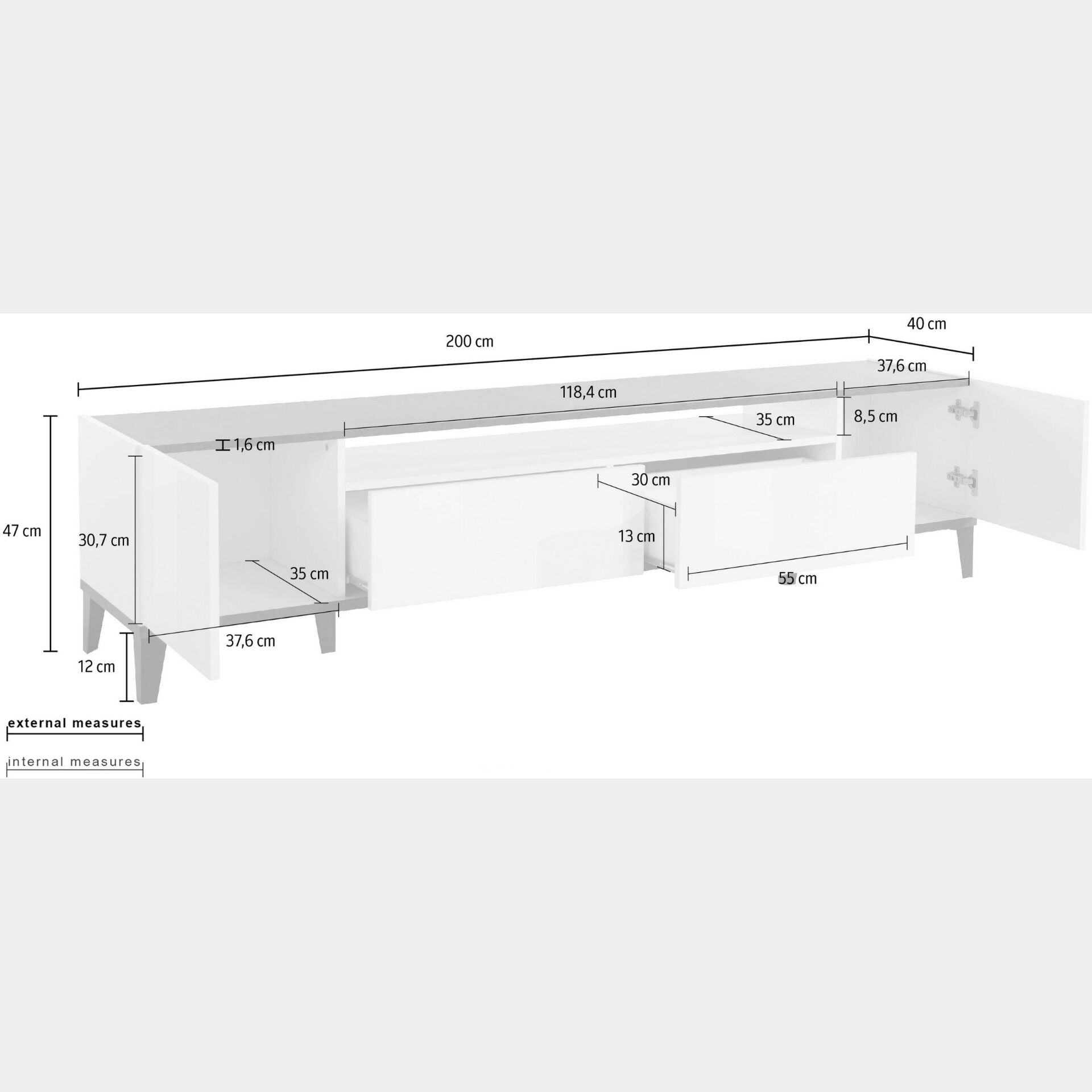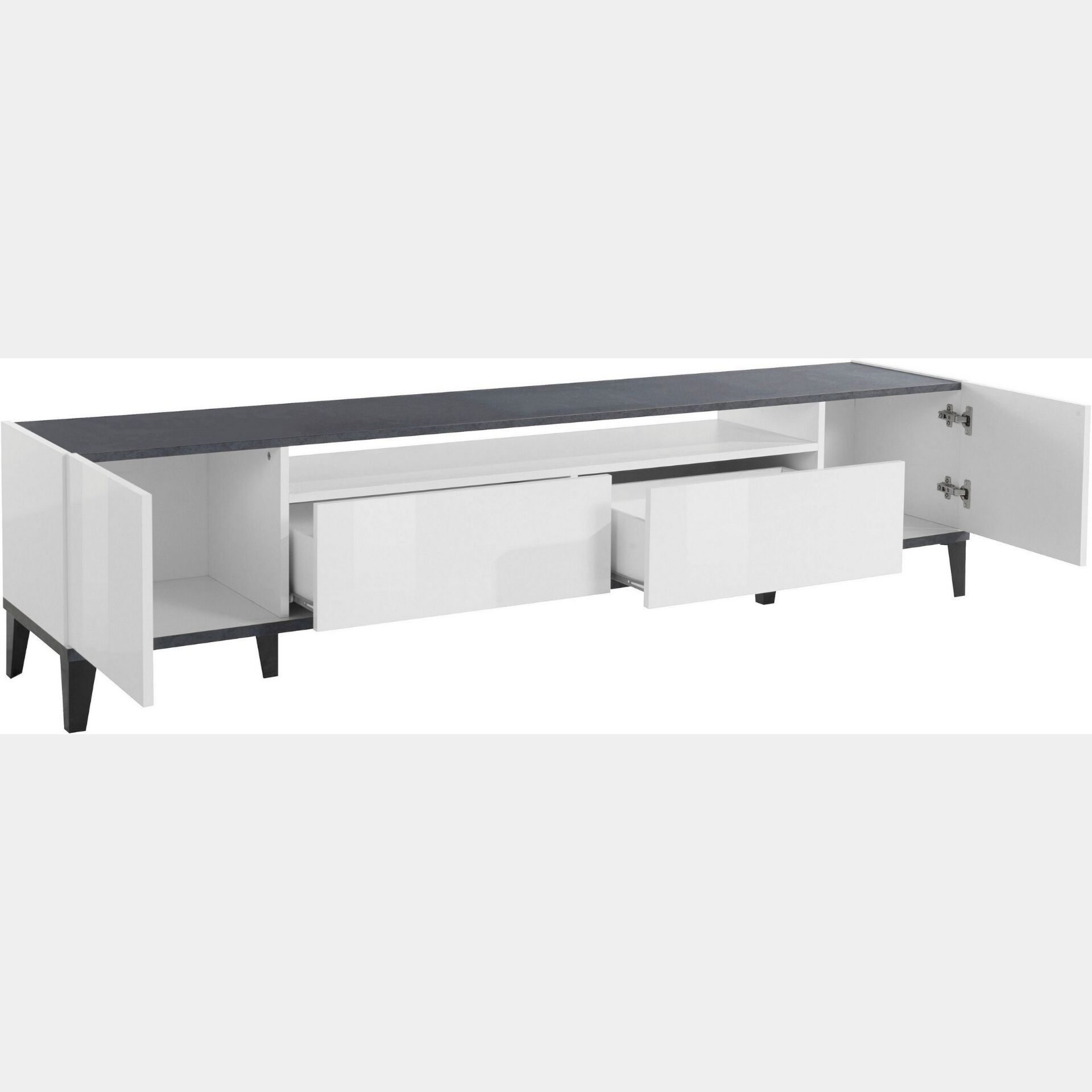La finitura proposta del porta Tv è Bianco lucido, di tendenza negli ultimi anni, che riscalda l'ambiente rendendolo accogliente ed elegante, e l'Ardesia, che gli dona carattere e definisce lo stile. Il mobile tv è disponibile nella versione in Bianco lucido e Pero oppure in Ardesia e Pero.