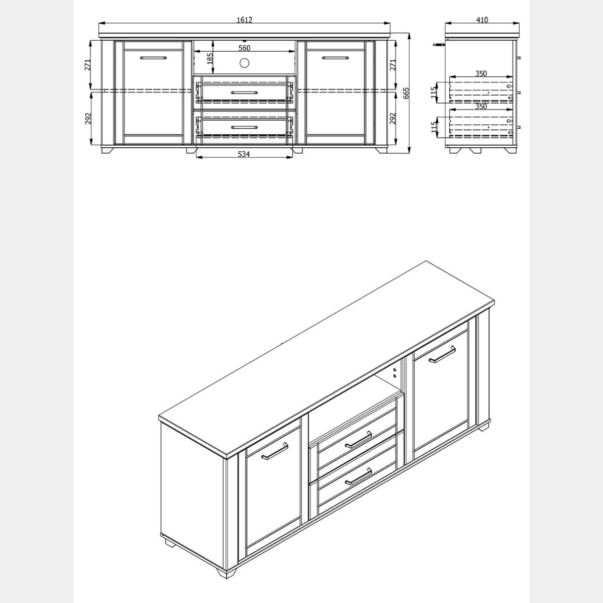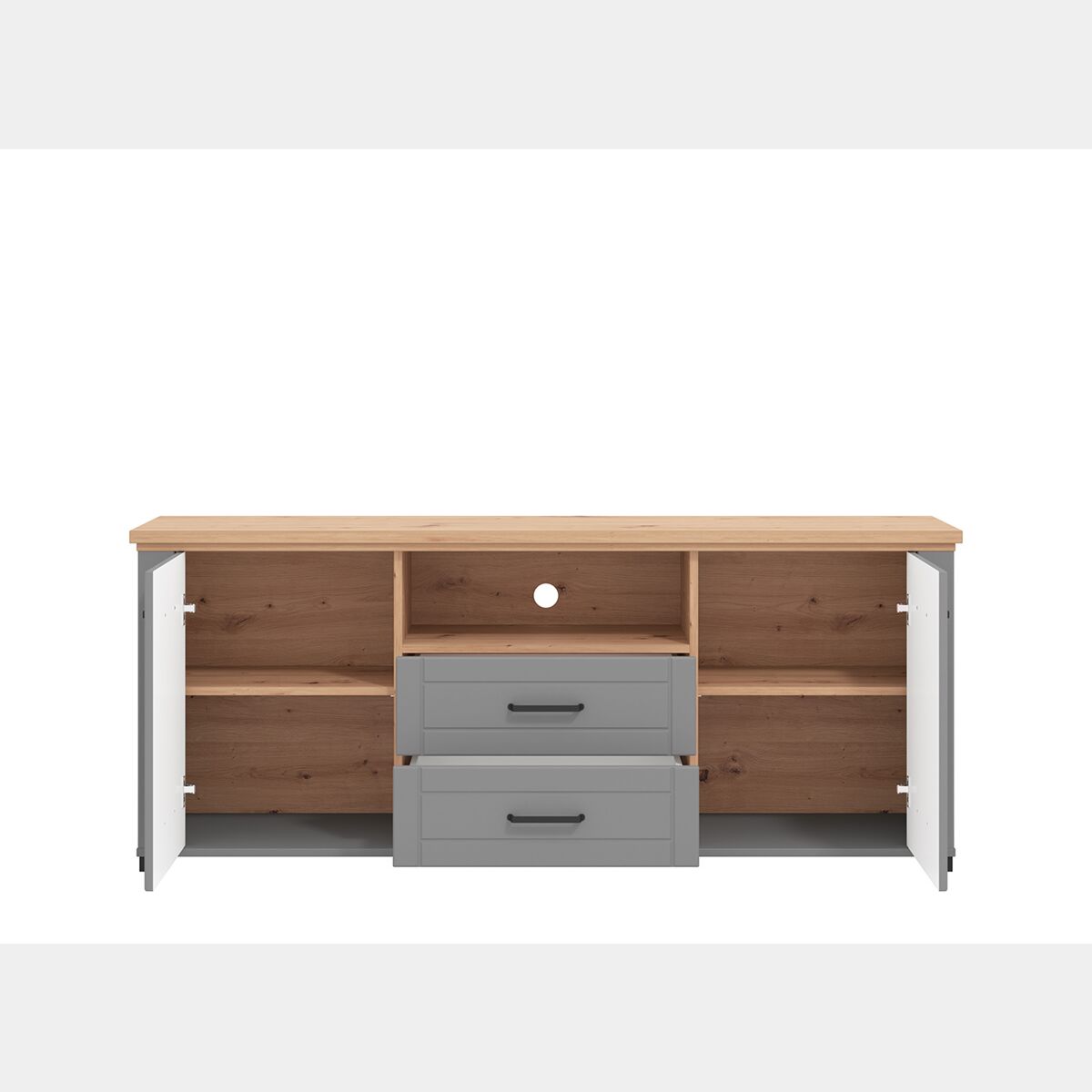 Il mobile tv è composto da due ante battenti esterne, due cassetti centrali e vano a giorno. La suddivisione dello spazio assicura un'ampia capienza per tutti gli apparecchi collegati alla televisione, come playstation, lettori dvd e molto altro. All'interno di ogni anta è previsto un ripiano centrale che crea due vani a giorno. Lo schienale è dotato di foro passacavi.