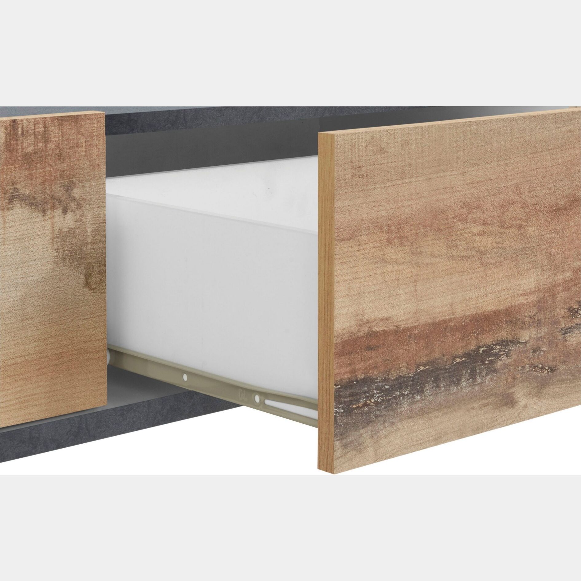 La finitura proposta del porta Tv è Pero, con mille sfumature più chiare e scure, e l'Ardesia, che gli dona carattere e definisce lo stile. Il contrasto che si genera assicura un mobile tv di caratteristico e di impatto.