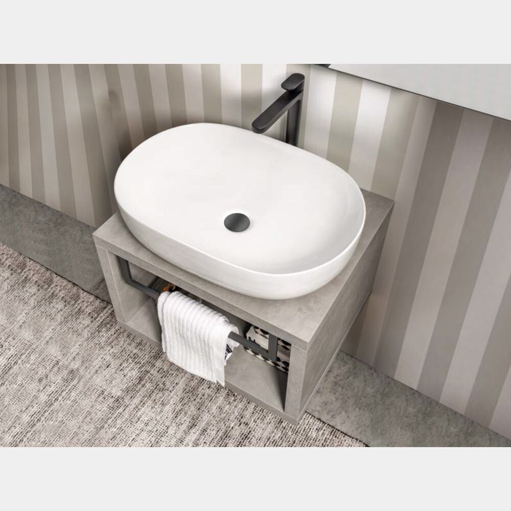 La consolle sono realizzate con pannelli in agglomerato di legno con superficie in lamina melaminica in finitura Cemento grigio caldo con texure in rilievo, sono caratterizzate dalla presenza di un portasciugamani in metallo nella finiura Antracite. I mobili da bagno possono essere forniti con il lavabo in appoggio in ceramica nella finitura bianco lucido (optional), con specchi supportati da un pannello in MDF nero, con lampade illuminazione Led a basso consumo di energia (optional), con pensili verticali dotati di 2 ripiani interni e ante con chiusura amortizzata. La consolle vengono fornite già assemblate. Piletta, sifone e tasselli non sono inclusi.