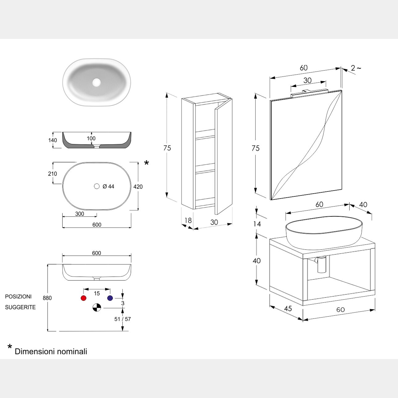 - Specchiera: L.60 H.75 Sp.2.5 cm (optional)
