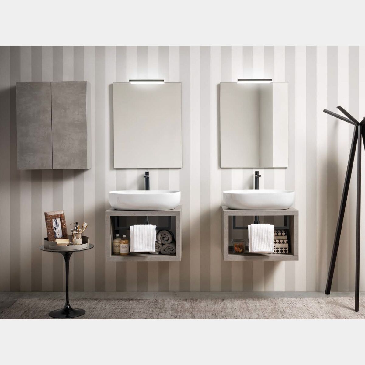 Un'idea bagno alterativa: doppio mobile sospeso da bagno con appendiasciugamani. I mobili bagno sospesi arrederrano il tuo bagno in modo elegante e ricercato.