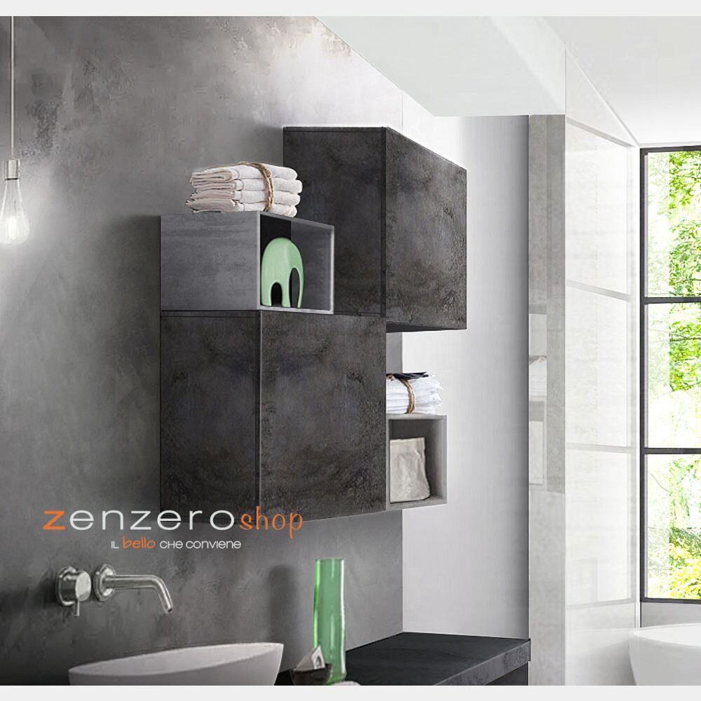 La composizione per bagno è composta da 2 cubi ad ante battente e 2 vani a giorno, legati dal un design moderno e funzionale, pensato per arredare un bagno moderno. I due cubi hanno struttura e frontale in finitura Ossido, mentre i due elmenti a giorno hanno struttura Gesso.
