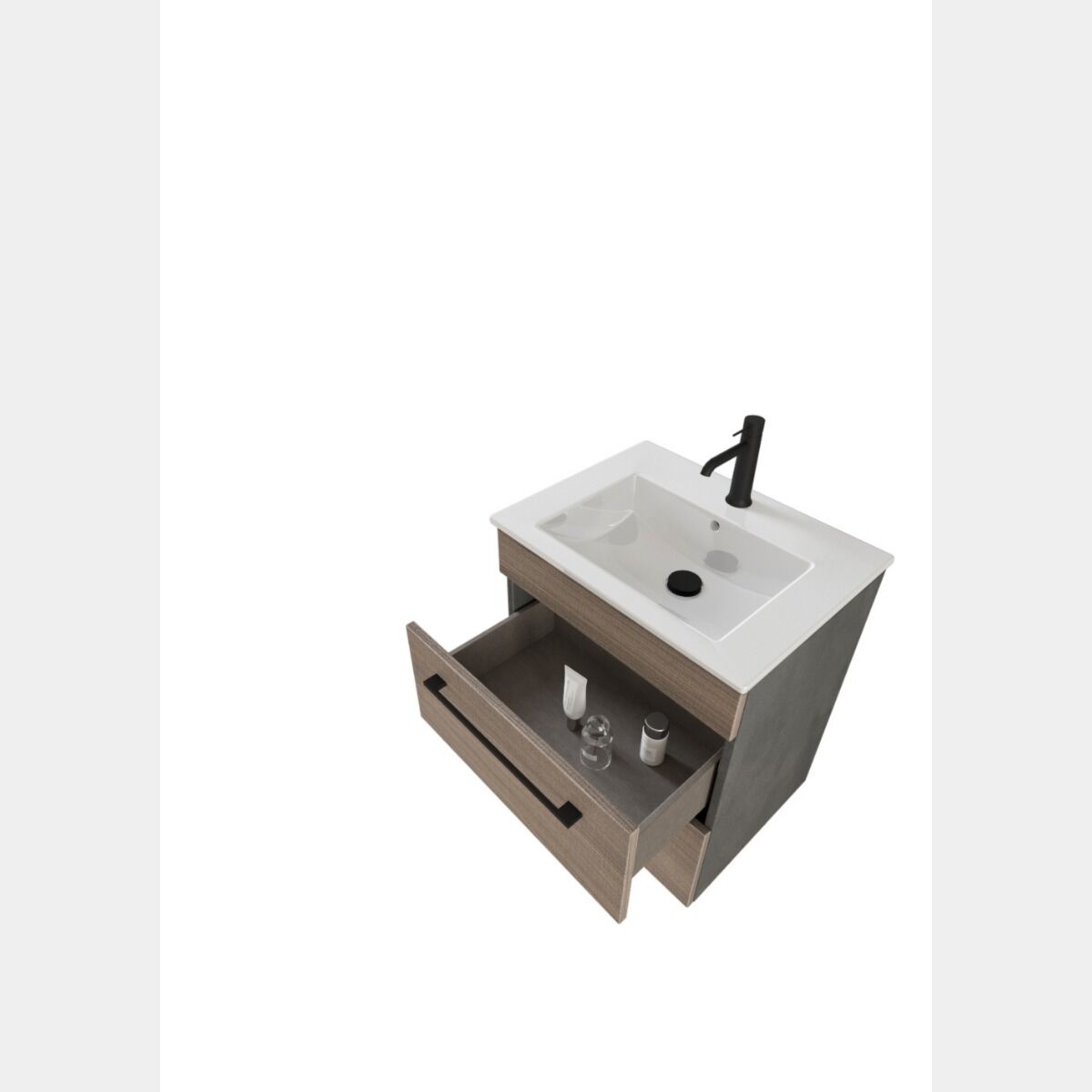 Il mobiletto bagno è realizzato con pannelli in agglomerato di legno con superfice in lamina melaminica in finitura medium elm e fianchi in finitura cemento grigio lava con texture in rilievo, è dotato di 2 cassetti con guide di scorrimento metalliche e apertura e chiusura ammortizzata ad estrazione totale, regolabili in alto/basso.