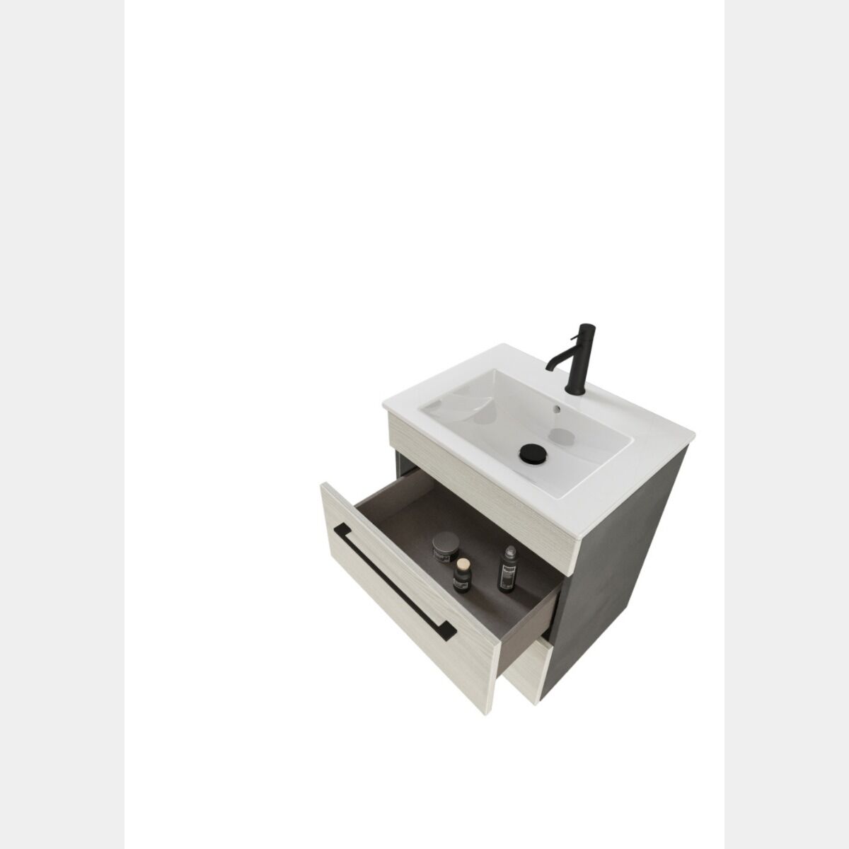 Il mobiletto bagno è realizzato con pannelli in agglomerato di legno con superfice in lamina melaminica in finitura white elm e fianchi in finitura cemento grigio lava con texture in rilievo, è dotato di 2 cassetti con guide di scorrimento metalliche e apertura e chiusura ammortizzata ad estrazione totale, regolabili in alto/basso.