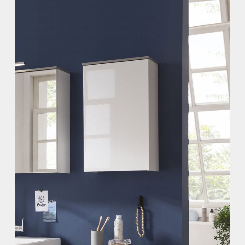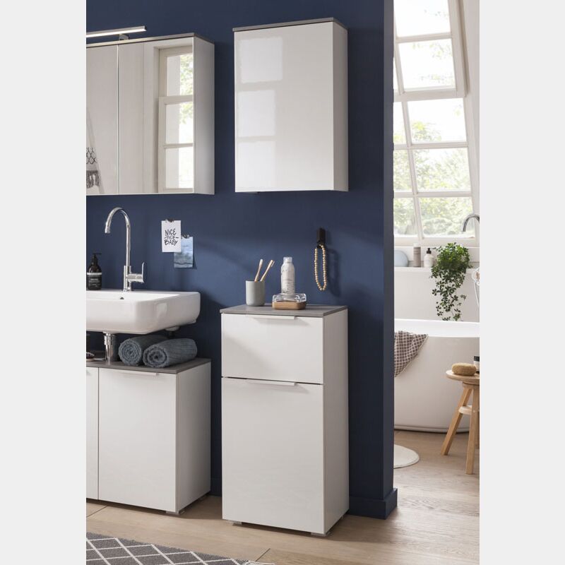 Mobile da bagno, 1 anta, made in Italy, bianco laccato con top grigio cemento.