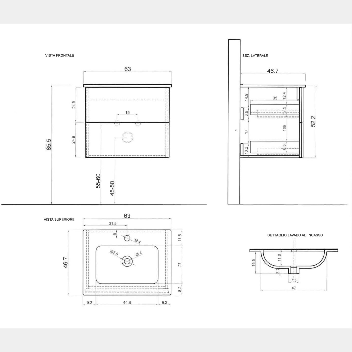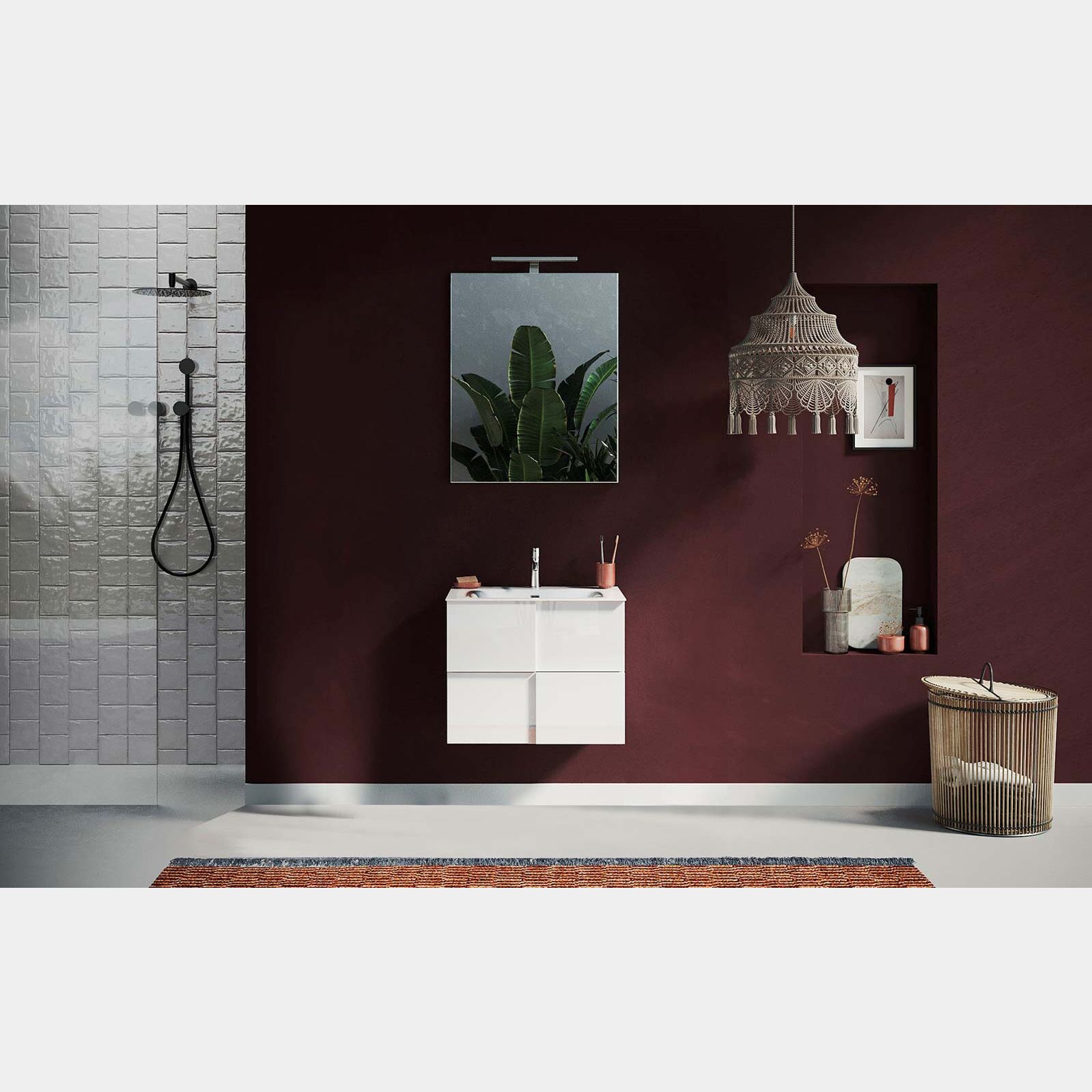 Il mobile da bagno viene fornito con lavabo in ceramica, i due cassetti sono dotati di chiusura soft-close, sistema che ne rallenta la corsa per preservare l'integrità del mobile nel tempo. Tramite apposito configuratore è possibile richiedere lo specchio rettangolare con led integrato.