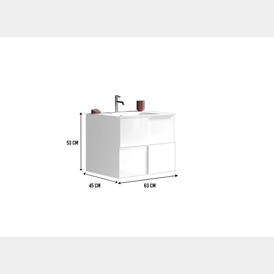Mobiletto da bagno L.63, bianco lucido sospeso a 2 cassetti