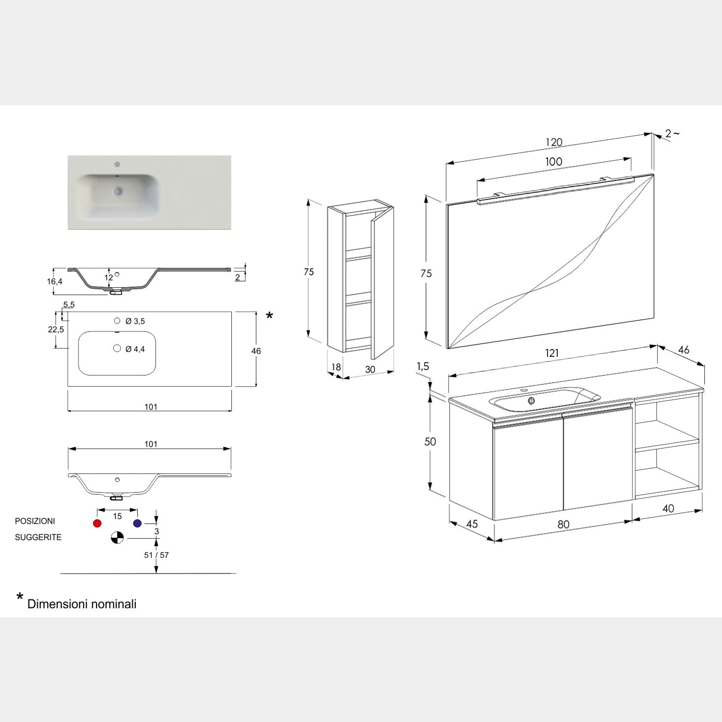 Il mobile bagno viene fornito con il lavabo integrato in solid surface, in finitura bianco lucido con troppopieno e foro miscelatore. Lo specchio rettangolare larghezza 120 cm altezza 75 cm supportato su pannello struttura in agglomerato di particelle di legno con lamina melaminica, la lampada con illuminazione LED a basso consumo di energia, IP44 e il pensile verticale con 2 ripiani interni sono optional.