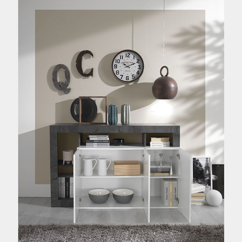 Madia a 3 ante in finitura bianco laccato lucido e Cemento. Questa madia si abbina a tutti gli ambienti grazie alle tonalità di colore e al suo design insolito.