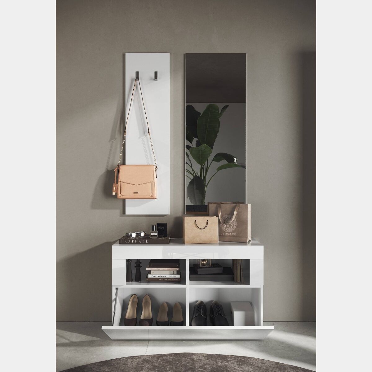 Mobili da ingresso con madia, panca, appendiabiti e specchio, Bianco lucido
