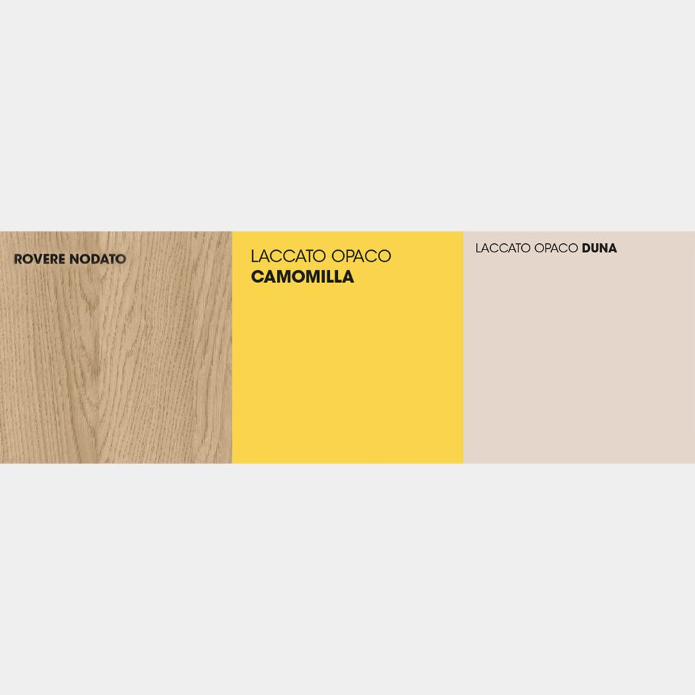 Le 5 ante battenti con pannello nobilitato antigrafio, sp 19 mm. sono “classe E1” con bordi arrotondati in ABS sp. 1,5 mm. Ferramenta e istruzioni di montaggio sono inserite nei pacchi forniti. Le cerniere e basette sono in acciaio con doppia regolazione in altezza e profondità. L'apertura delle ante avviene con meccanismo push-pull in pvc satinato.